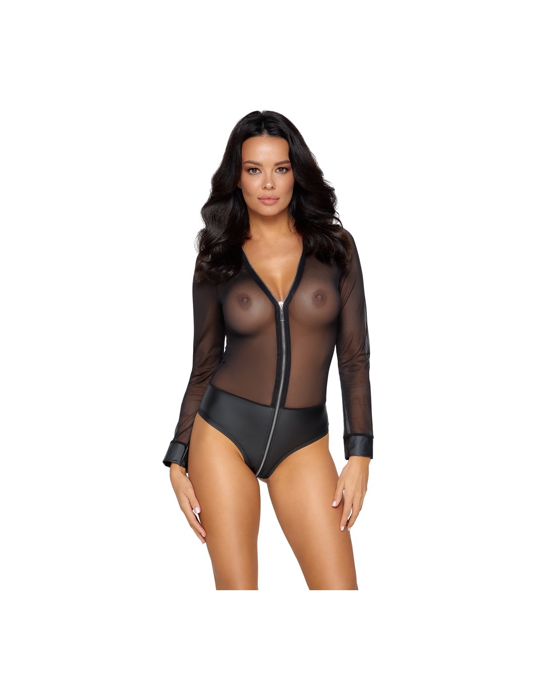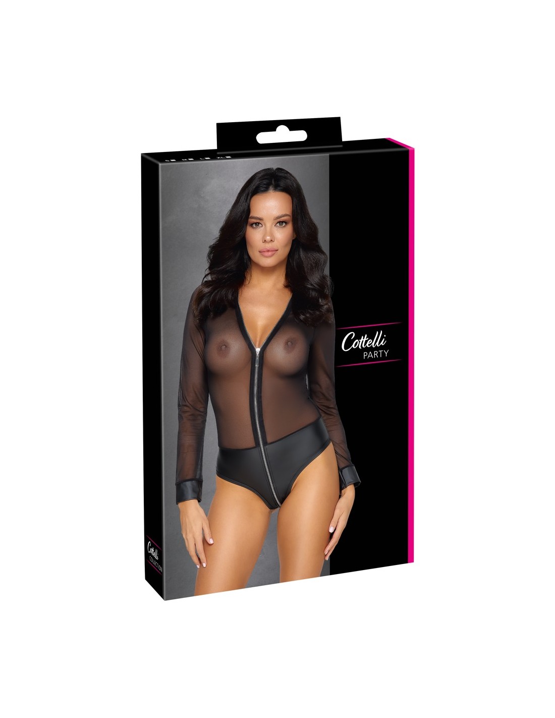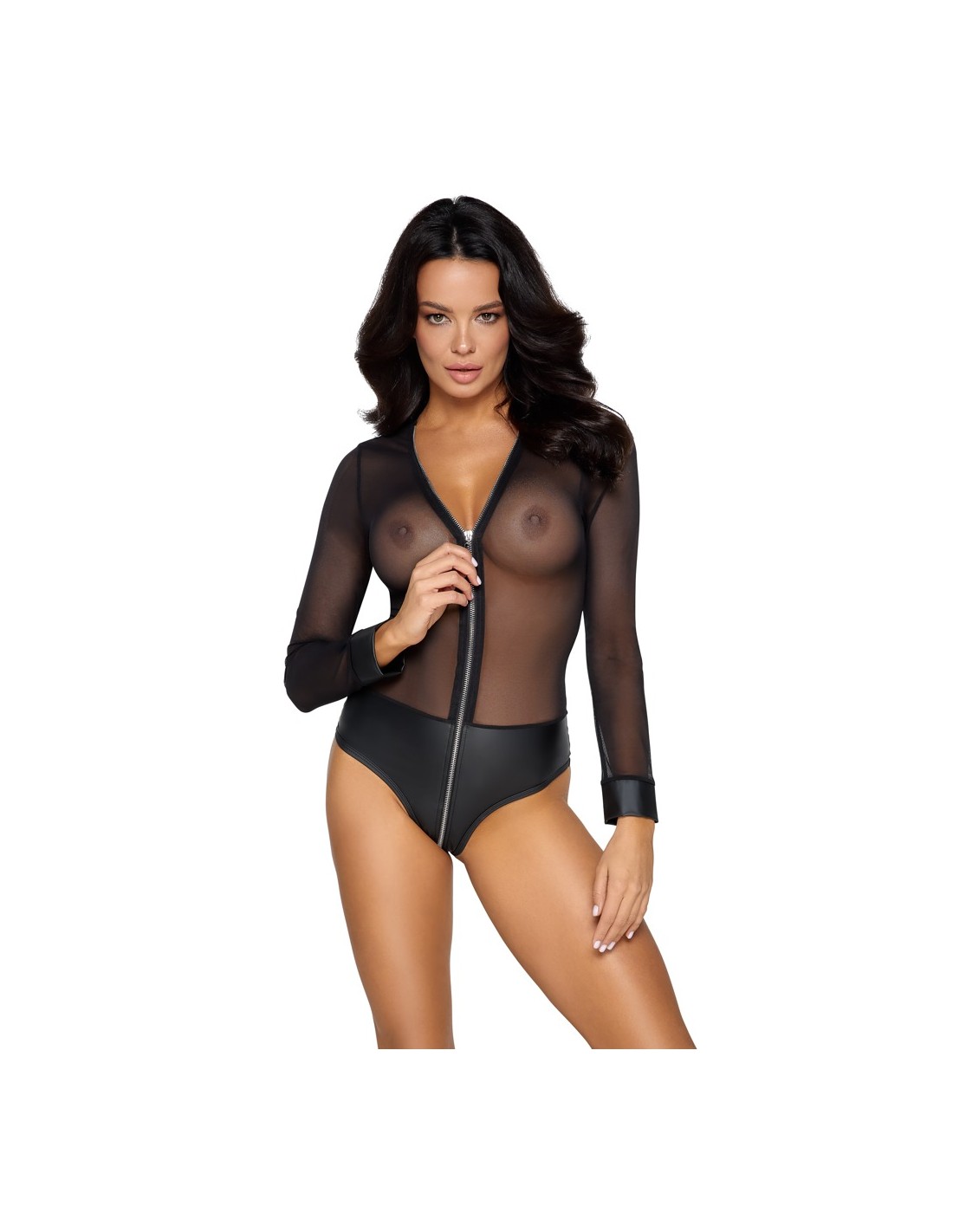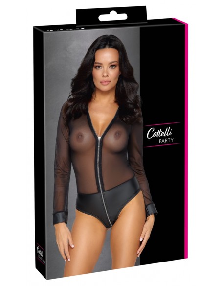 Body trasparente a maniche lunghe di Cottelli PARTY realizzato in fine powernet con mutandine opache integrate in un nobile aspetto opaco. Anche i polsini delle maniche hanno un aspetto opaco. Il suo tessuto morbido ed elastico offre un incredibile comfort aderente. La lunga zip color argento sul davanti si estende seducente dal collo al cavallo.