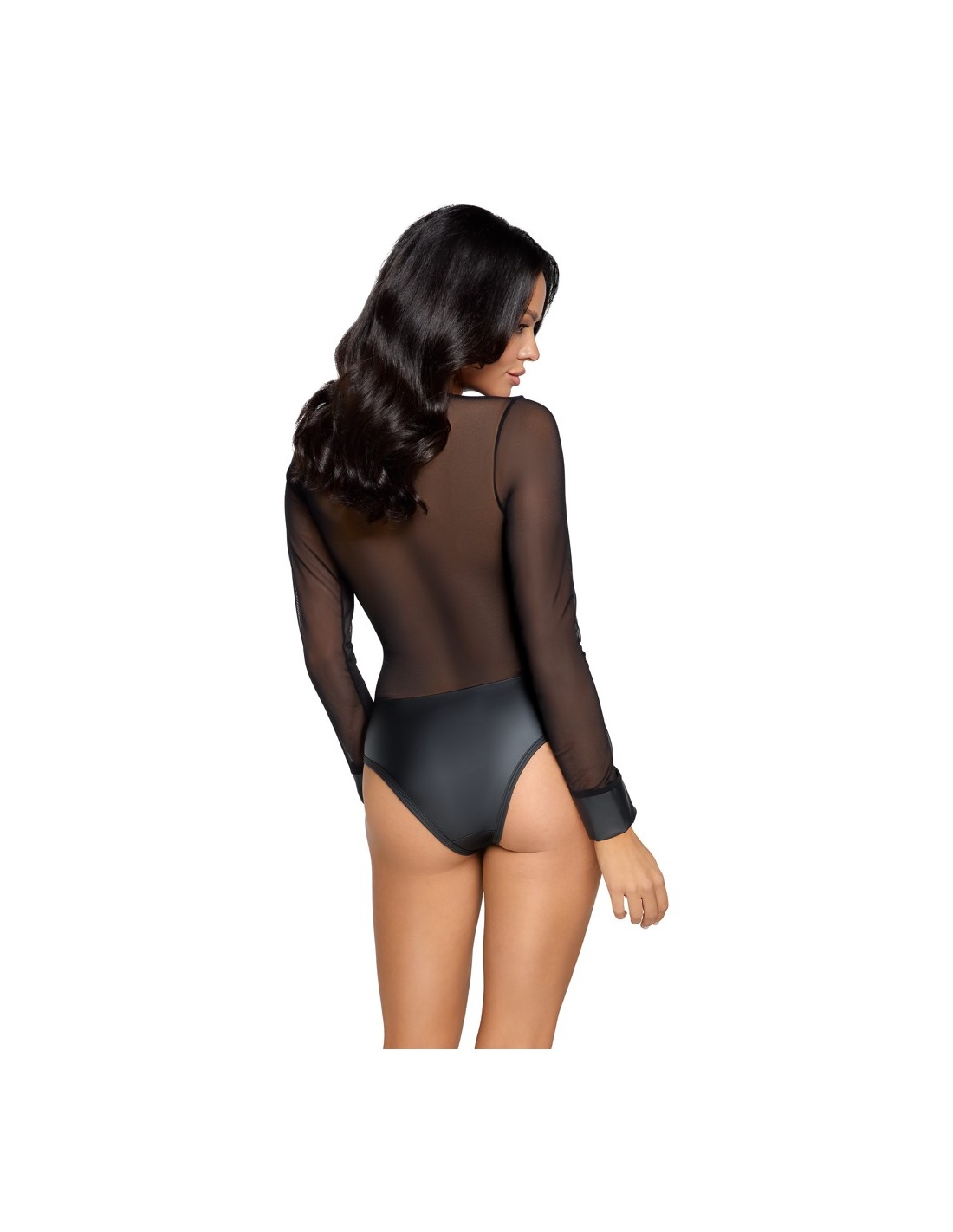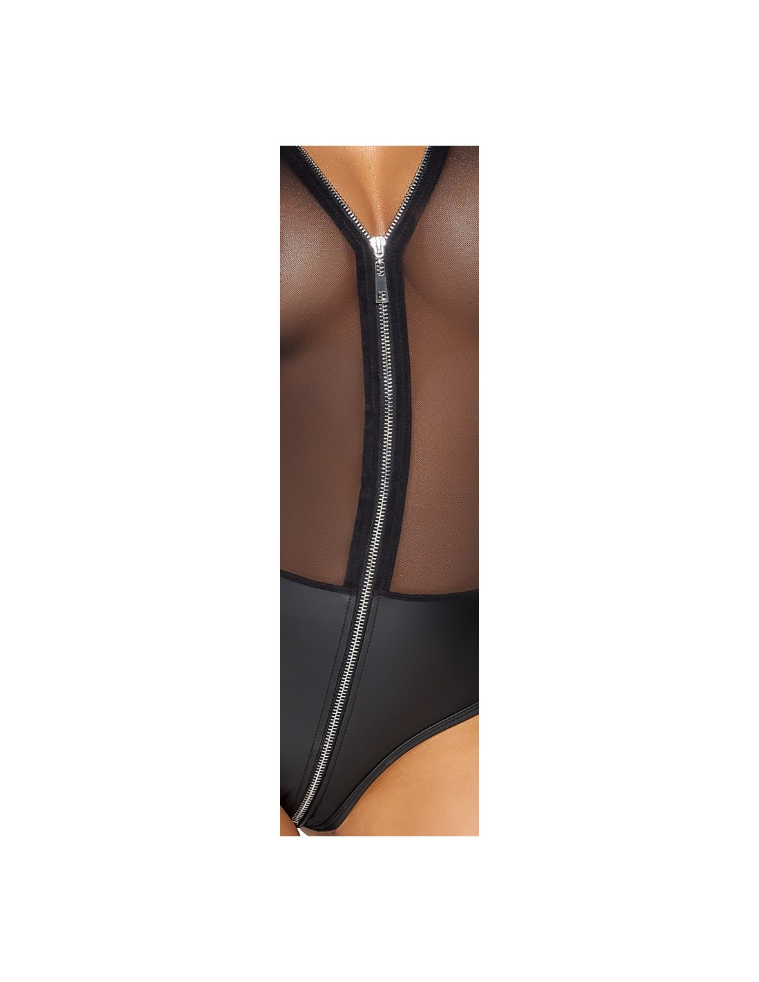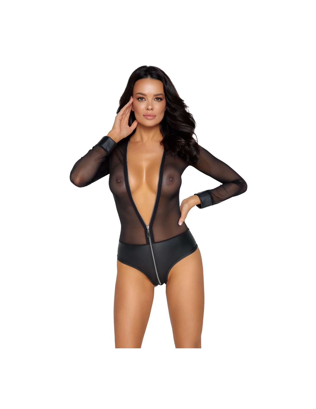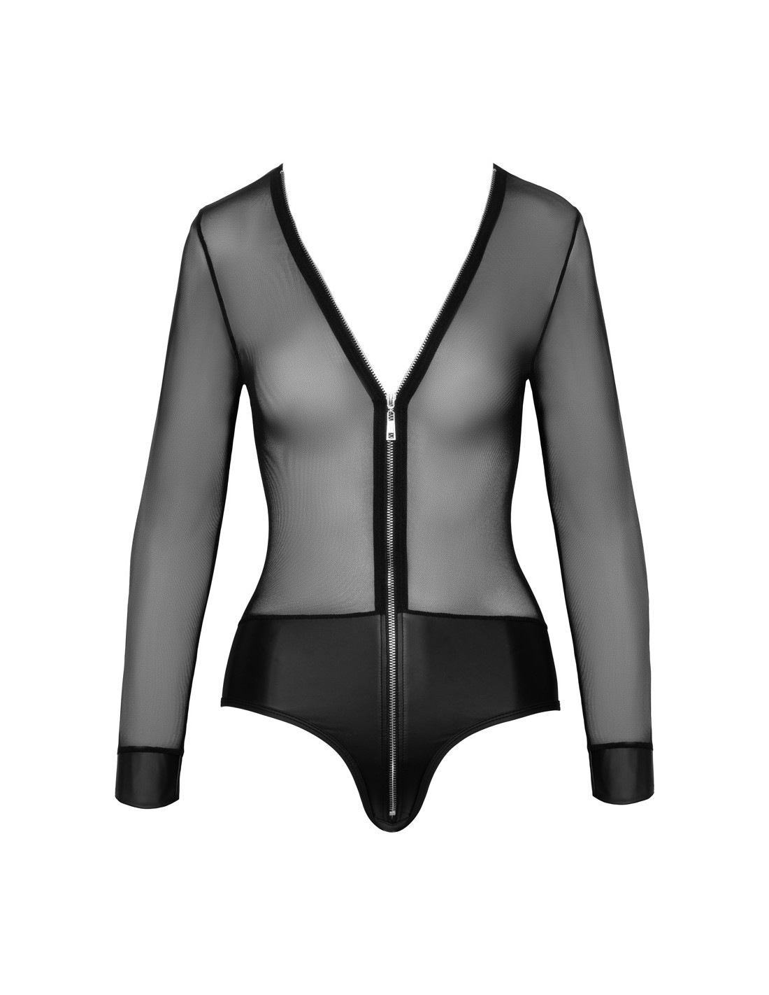Body trasparente a maniche lunghe di Cottelli PARTY realizzato in fine powernet con mutandine opache integrate in un nobile aspetto opaco. Anche i polsini delle maniche hanno un aspetto opaco. Il suo tessuto morbido ed elastico offre un incredibile comfort aderente. La lunga zip color argento sul davanti si estende seducente dal collo al cavallo.
