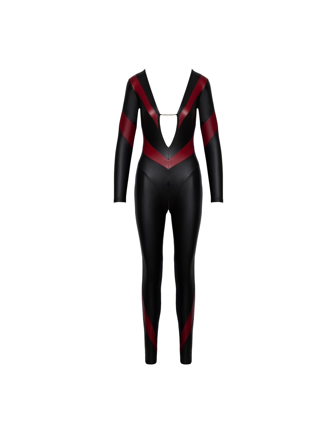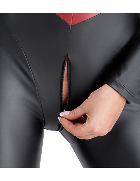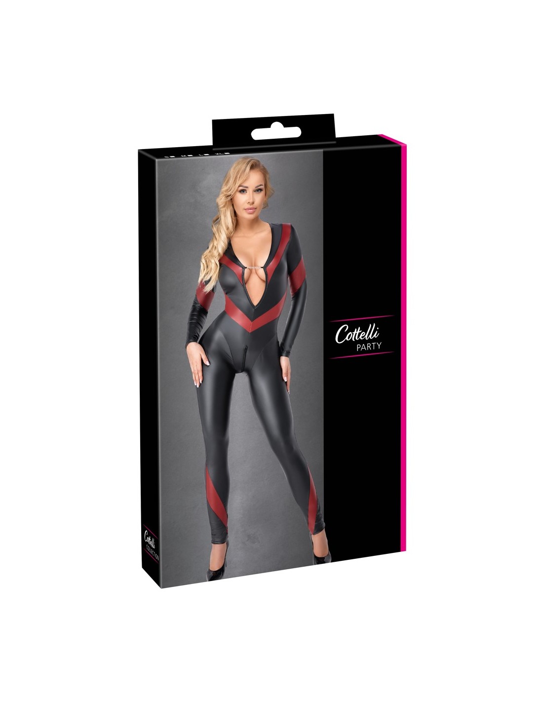 Tuta elasticizzata a tutto tondo di Cottelli PARTY in look nero opaco con strisce rosse a contrasto. Taglio attillato con maniche lunghe e gambe lunghe e strette. Davanti taglio basso fino alla pancia, una catena color argento tiene tutto bene insieme. La parte posteriore ha una cerniera a 3 vie dal collo attraverso il cavallo fino alla parte anteriore.