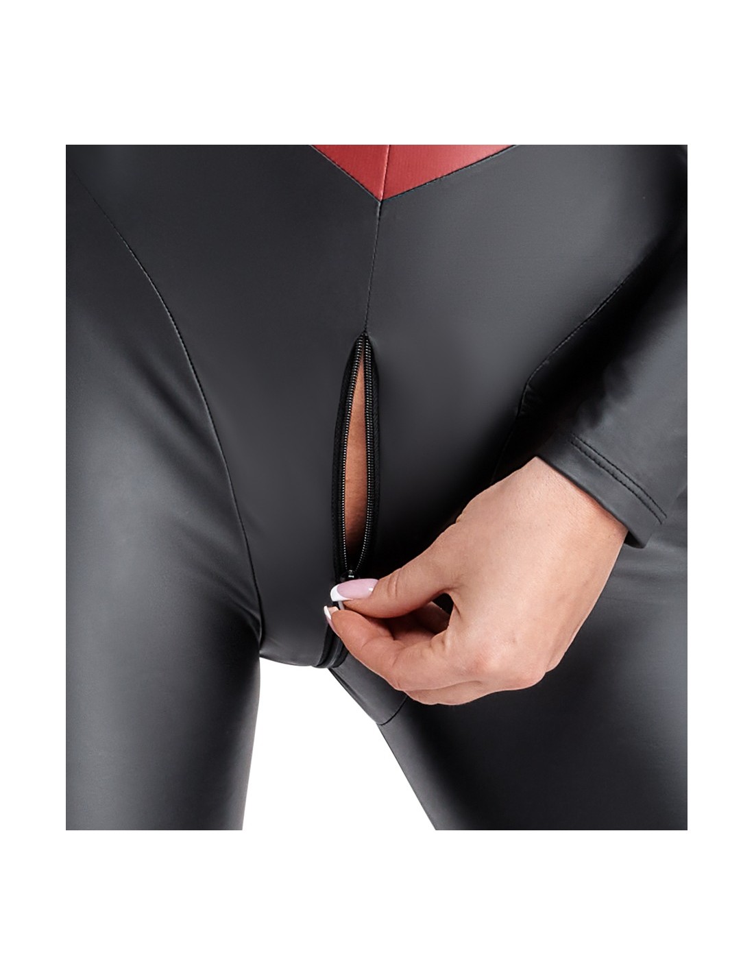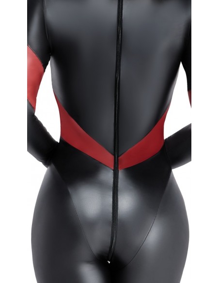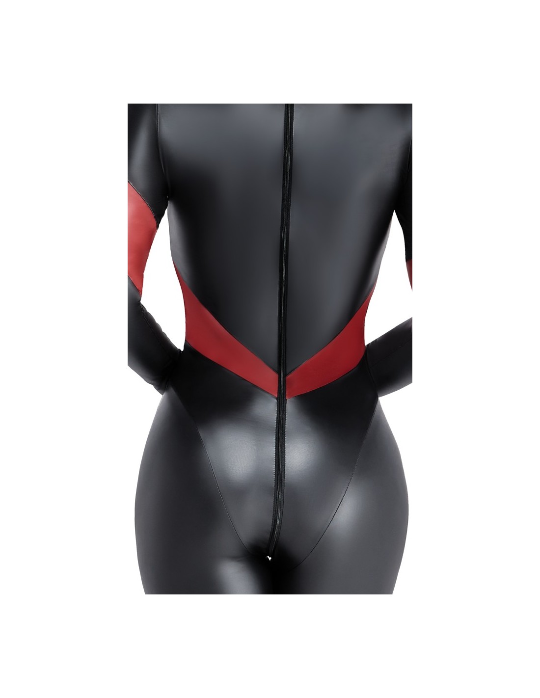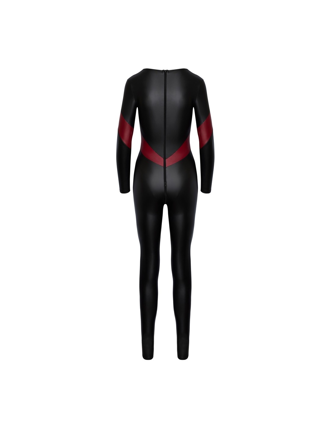 Tuta elasticizzata a tutto tondo di Cottelli PARTY in look nero opaco con strisce rosse a contrasto. Taglio attillato con maniche lunghe e gambe lunghe e strette. Davanti taglio basso fino alla pancia, una catena color argento tiene tutto bene insieme. La parte posteriore ha una cerniera a 3 vie dal collo attraverso il cavallo fino alla parte anteriore.