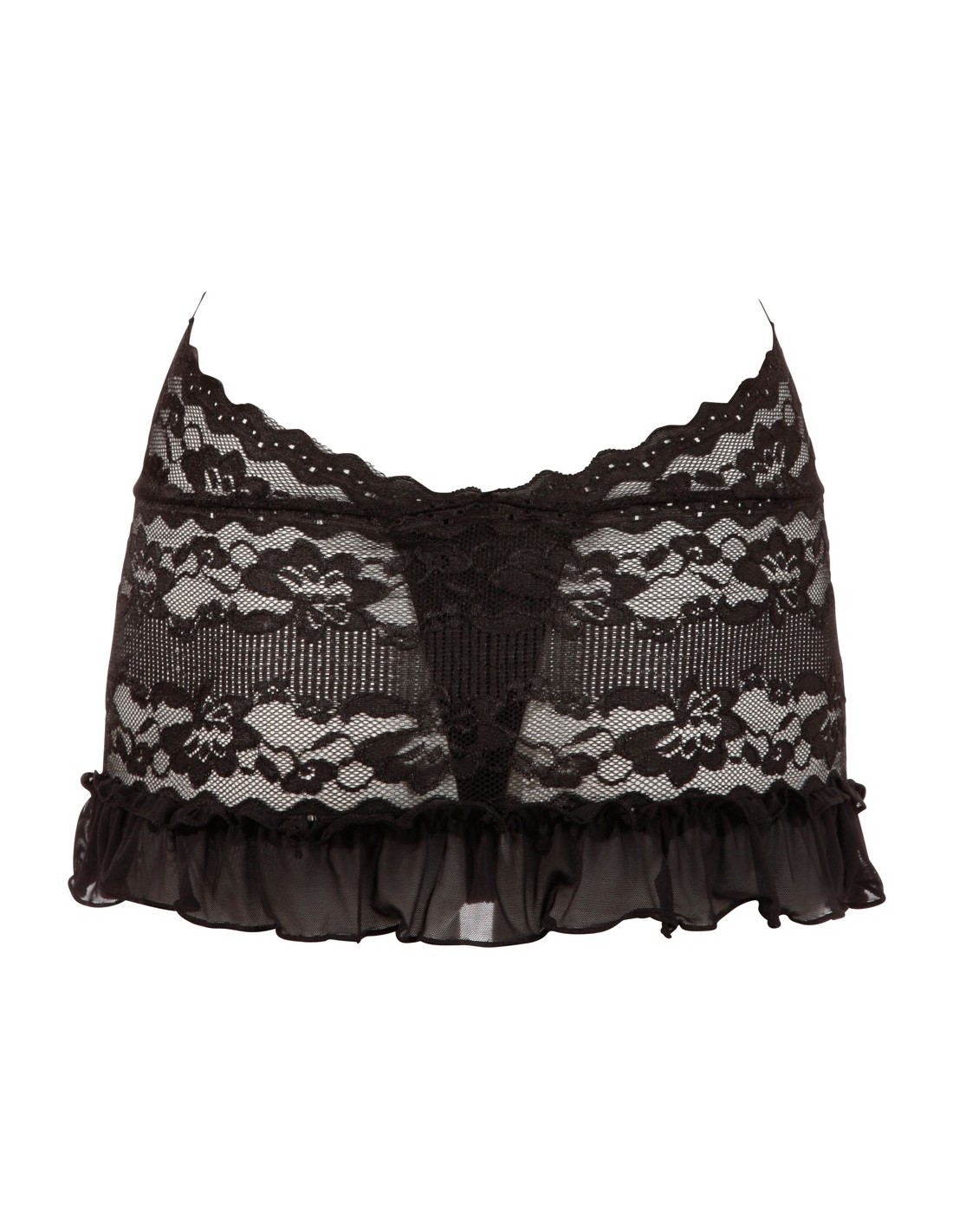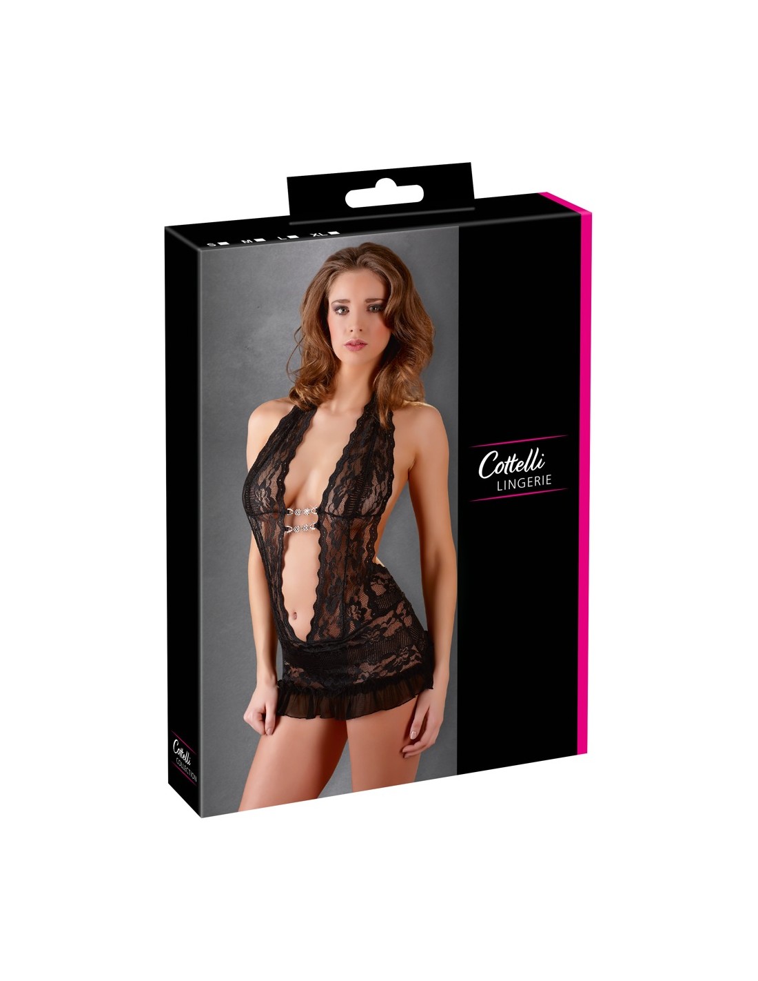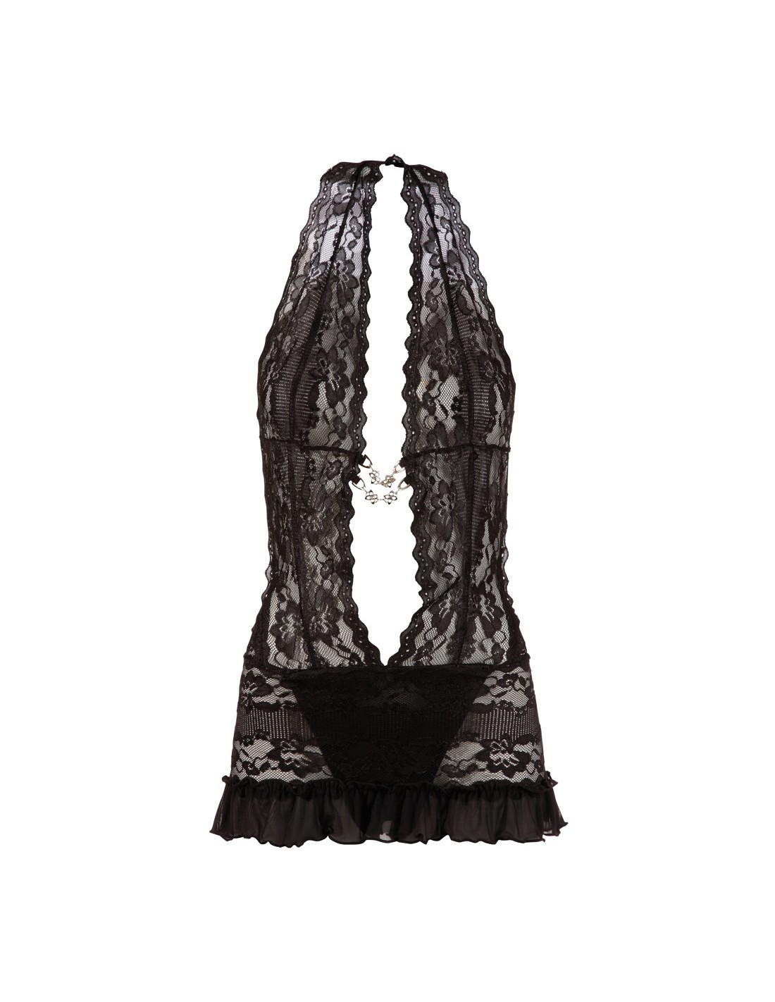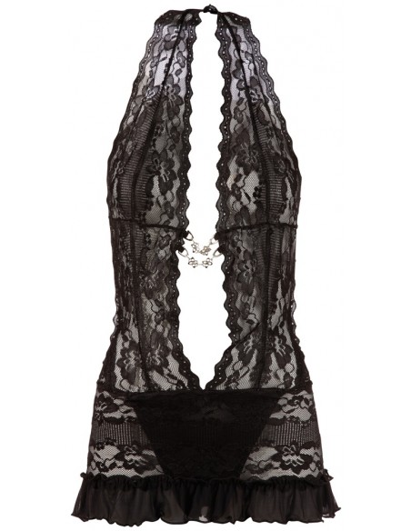Delicato abito in pizzo floreale. Con collo a metà e scollatura extra profonda, che è tenuta insieme sul davanti solo da 2 catene decorative. La parte posteriore rimane completamente libera. Compreso il filo cucito ouvert. Il pizzo è soggetto a modifiche.