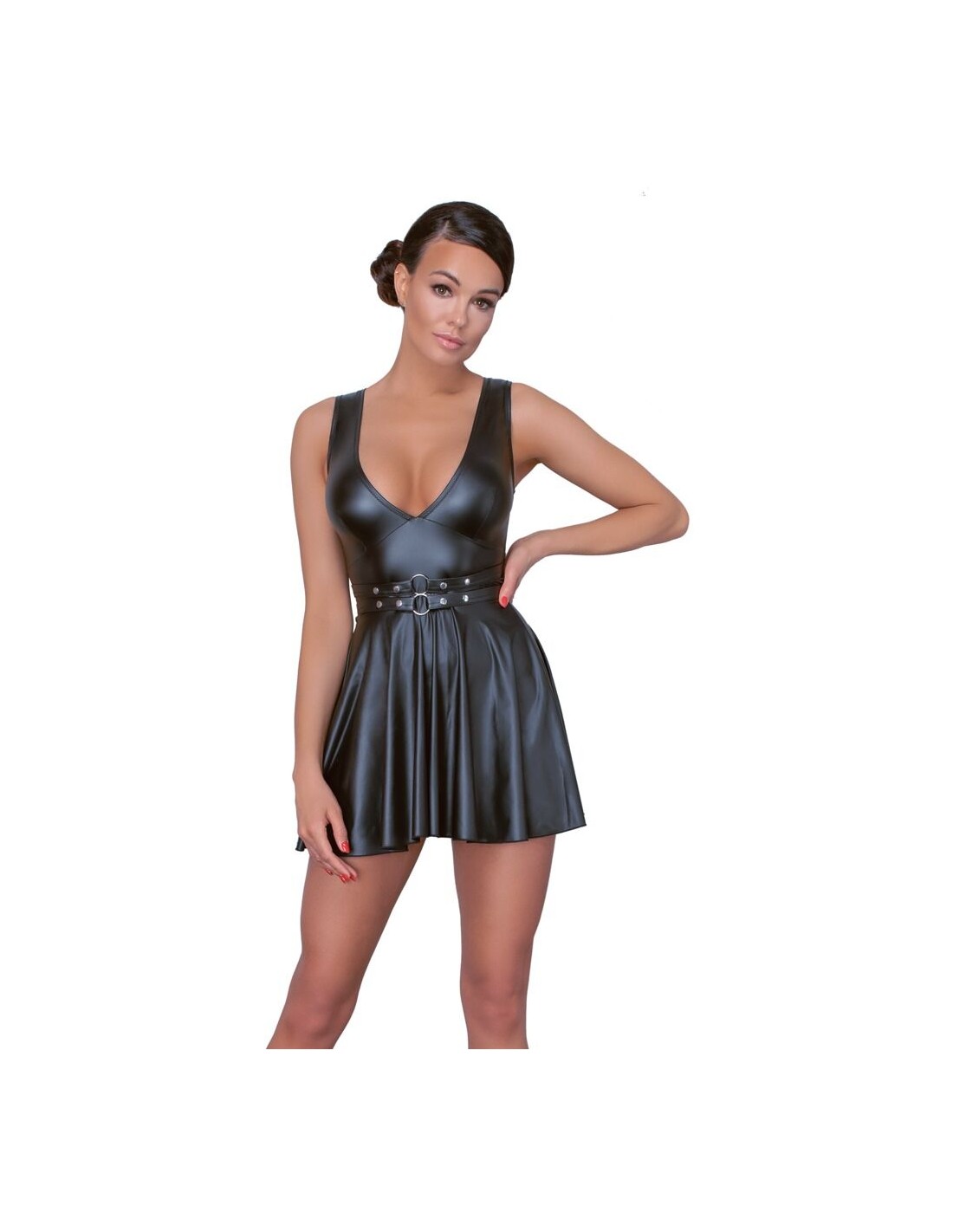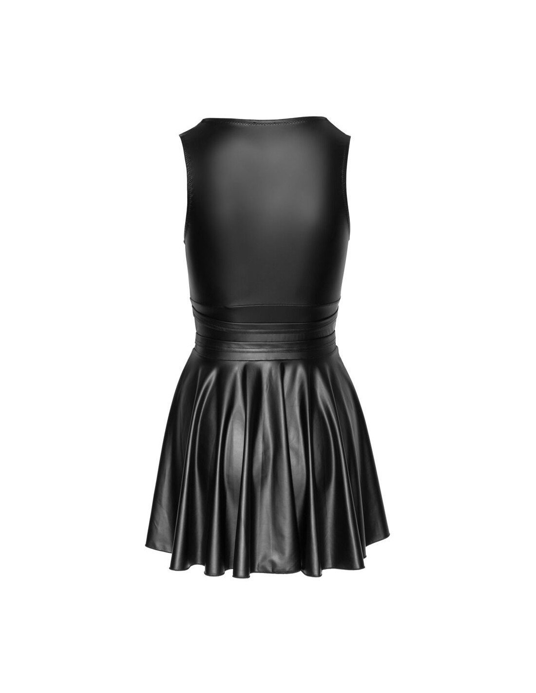 Abito corto in vita in look nero opaco con inserti in powernet trasparente sul davanti M