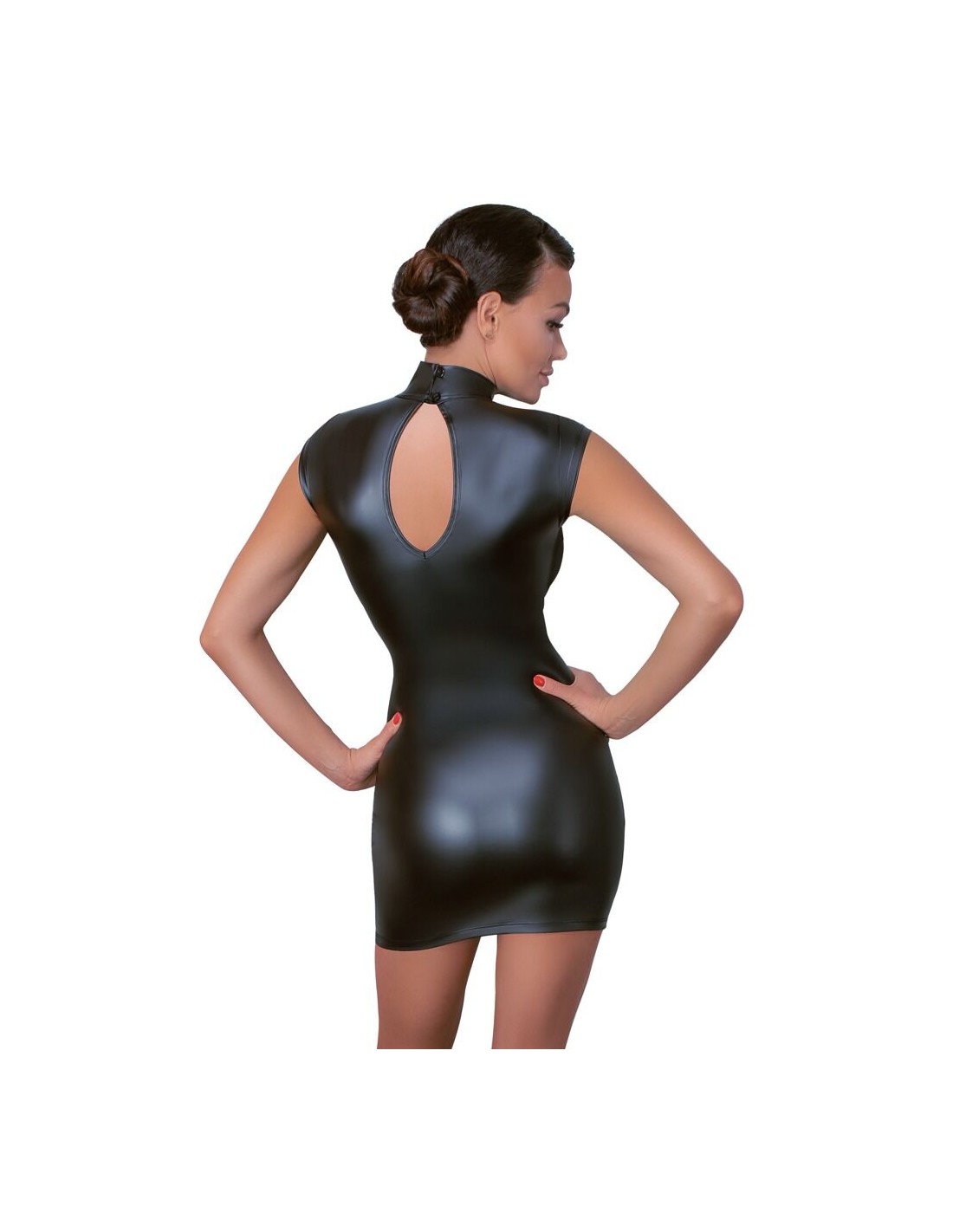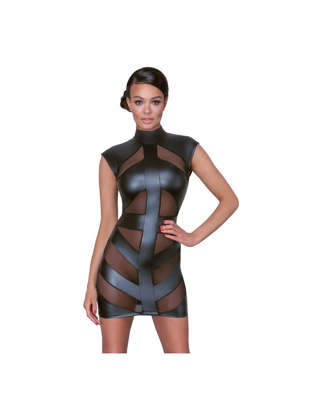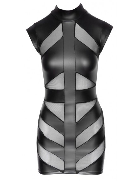 Abito corto in vita di Cottelli PARTY in look nero opaco con inserti in powernet trasparente sul davanti. Colletto in piedi con 2 bottoni nel collo, grande ritaglio ovale nella parte posteriore in basso. Morbido e altamente elastico per un elevato comfort di vestibilità.