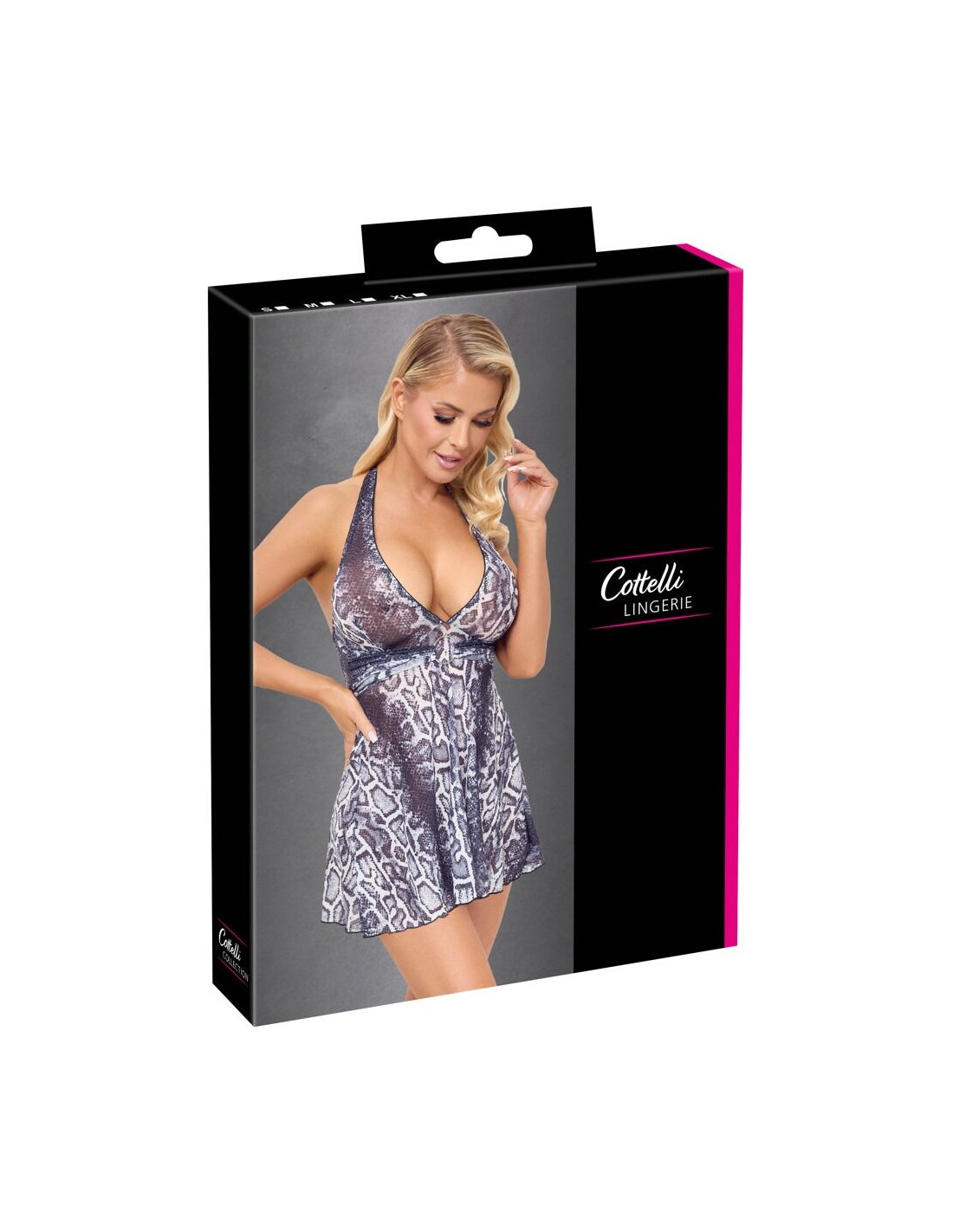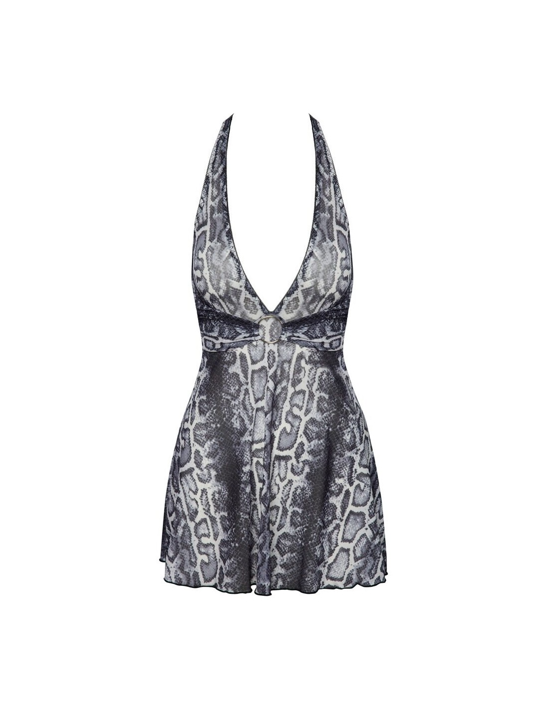 Abito corto leggermente svasato di Cottelli LINGERIE in look serpente. Extra scollato e accentuato da un grande anello argentato. Senza schienale e con un collo a farfalla da annodare. Realizzato interamente in powernet fine e trasparente con una stampa intricata. Elastico e morbido su tutta la superficie per un elevato comfort.