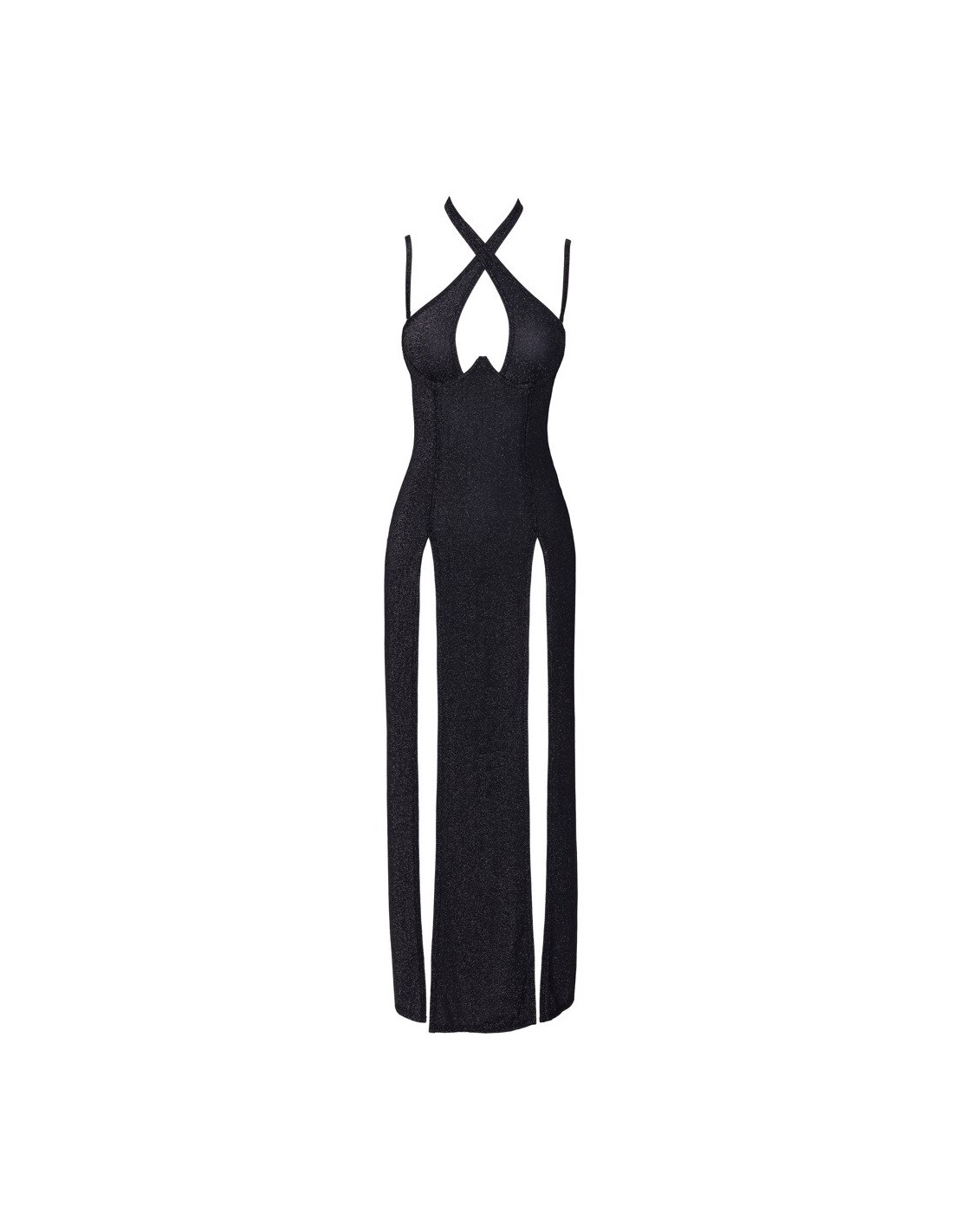 Elegante abito lungo di Cottelli PARTY in nero argento scintillante. Taglio aderente con coppe integrate con ferretto per un bel décolleté. Con un collo alto (chiusura a gancio) che può essere indossato anche incrociato sul davanti. Senza schiena e senza spalle - le spalline lucide aggiuntive e regolabili sono staccabili. La gonna lunga e aderente ha due alti spacchi sul davanti per una libertà di movimento ottimale e tanto sex appeal. Il materiale glitterato elasticizzato è morbido sulla pelle per un elevato livello di comfort.
