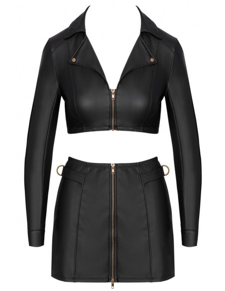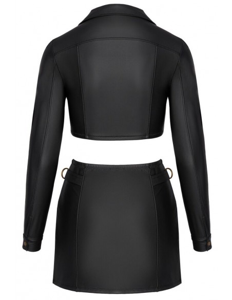 Set clubwear di Cottelli PARTY con top giacca corta e minigonna in look nero opaco con dettagli color ottone. Morbido ed elasticizzato su tutta la superficie per un elevato livello di comfort. Top giacca aderente e senza pancia con cerniera corta a tutta lunghezza sul davanti. Borchie decorative sul collo revers e bottoni a pressione sui polsini. La minigonna sottile è dotata di una cerniera a due vie a tutta lunghezza sul davanti e di anelli laterali sulla fascia elastica in vita.