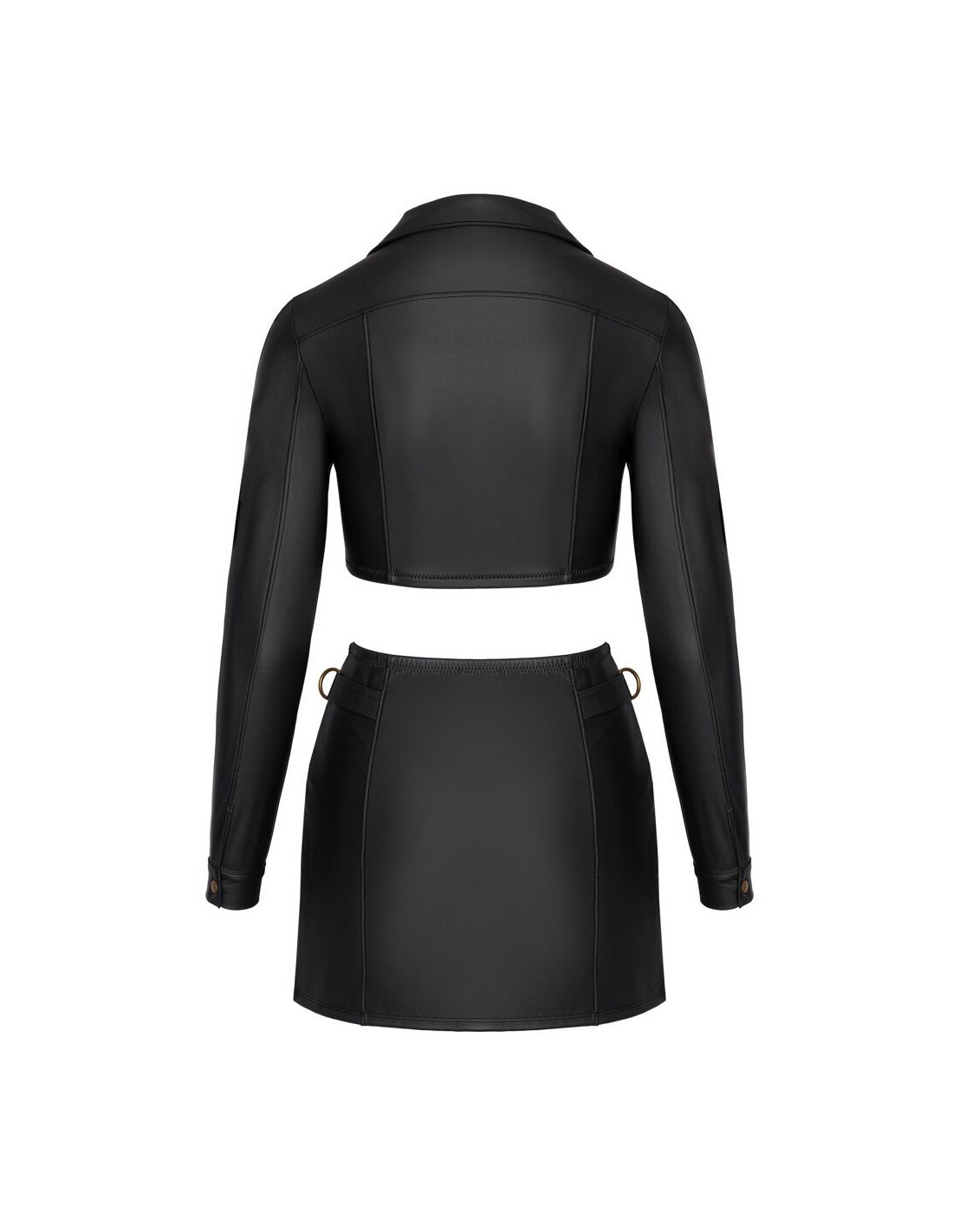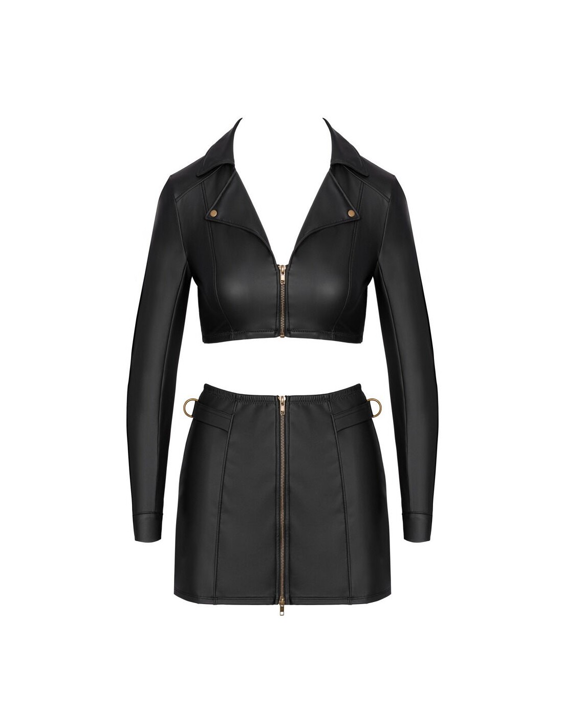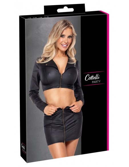 Set clubwear di Cottelli PARTY con top giacca corta e minigonna in look nero opaco con dettagli color ottone. Morbido ed elasticizzato su tutta la superficie per un elevato livello di comfort. Top giacca aderente e senza pancia con cerniera corta a tutta lunghezza sul davanti. Borchie decorative sul collo revers e bottoni a pressione sui polsini. La minigonna sottile è dotata di una cerniera a due vie a tutta lunghezza sul davanti e di anelli laterali sulla fascia elastica in vita.
