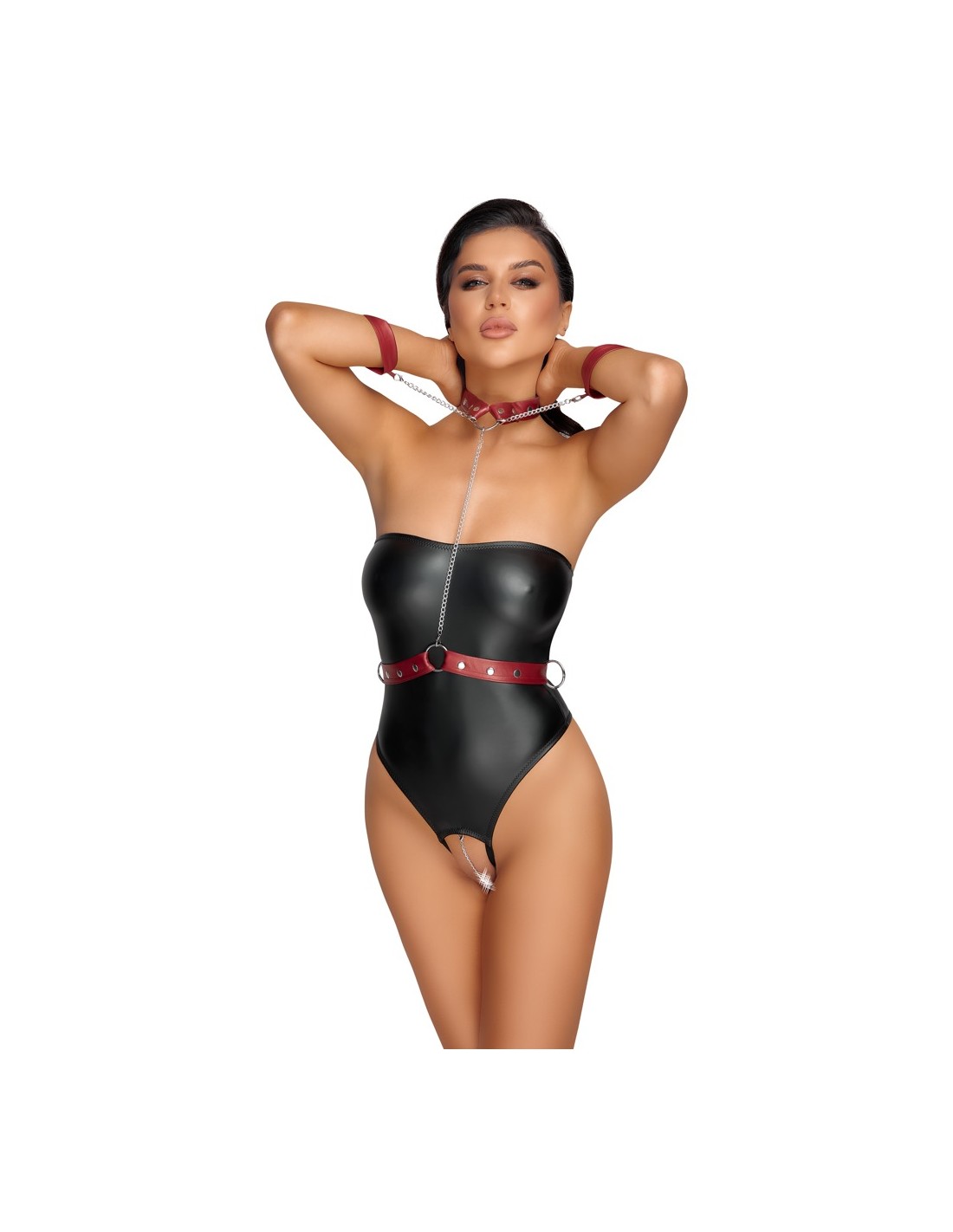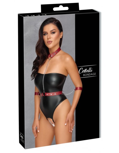 Corpo di stringa off-the-shoulder crotchless di Cottelli BONDAGE in un nobile look nero opaco. Viene fornito con una pettorina staccabile in look rosso opaco con accessori in metallo color argento. Le catene a moschettone sono staccabili dall'imbracatura, in modo che il collare, la cintura e le manette possano essere indossati anche da soli. Il colletto e la cintura sono regolabili con bottoni a pressione, le manette con chiusure in velcro. Una catena stimolante passa attraverso il cavallo completamente aperto, che può anche essere rimosso.