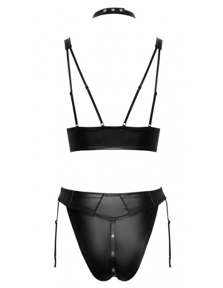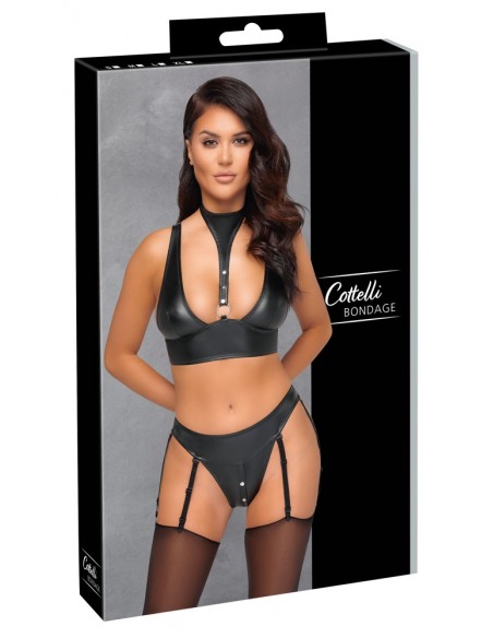 Set bralette e perizoma reggicalze di Cottelli BONDAGE in un elegante look nero opaco con dettagli color argento. Bralette con scollo profondo con anello e spalline fino al collo con chiusura regolabile con bottoni a pressione sulla nuca. Le spalline larghe si dividono in 4 spalline sottili sul retro e sono ciascuna regolabile per adattarsi. Perizoma con reggicalze alto fino alla vita e chiusura con bottoni a pressione fino al fondo. Per accattivanti momenti di piacere, un morbido polsino è saldamente cucito sul retro della cintura del perizoma. Le bretelle regolabili sono removibili dal perizoma.