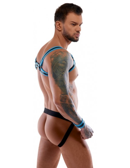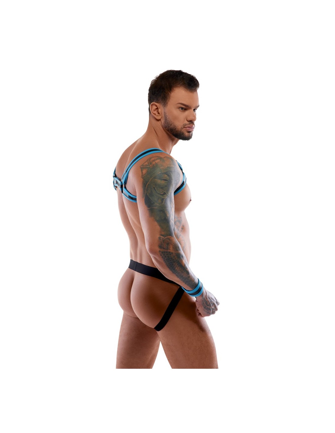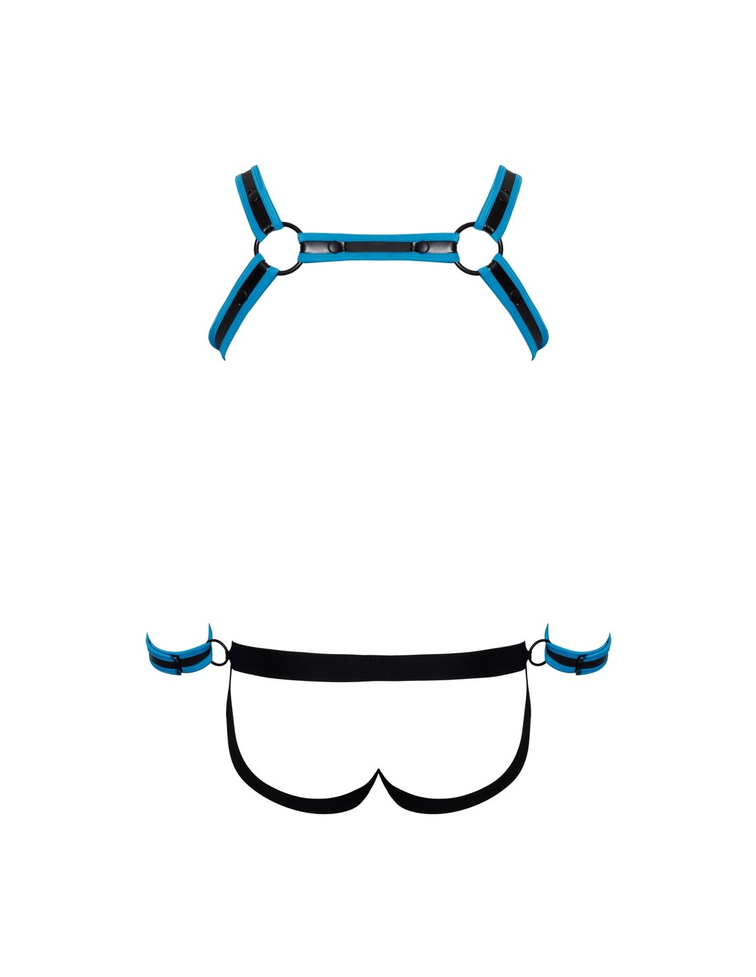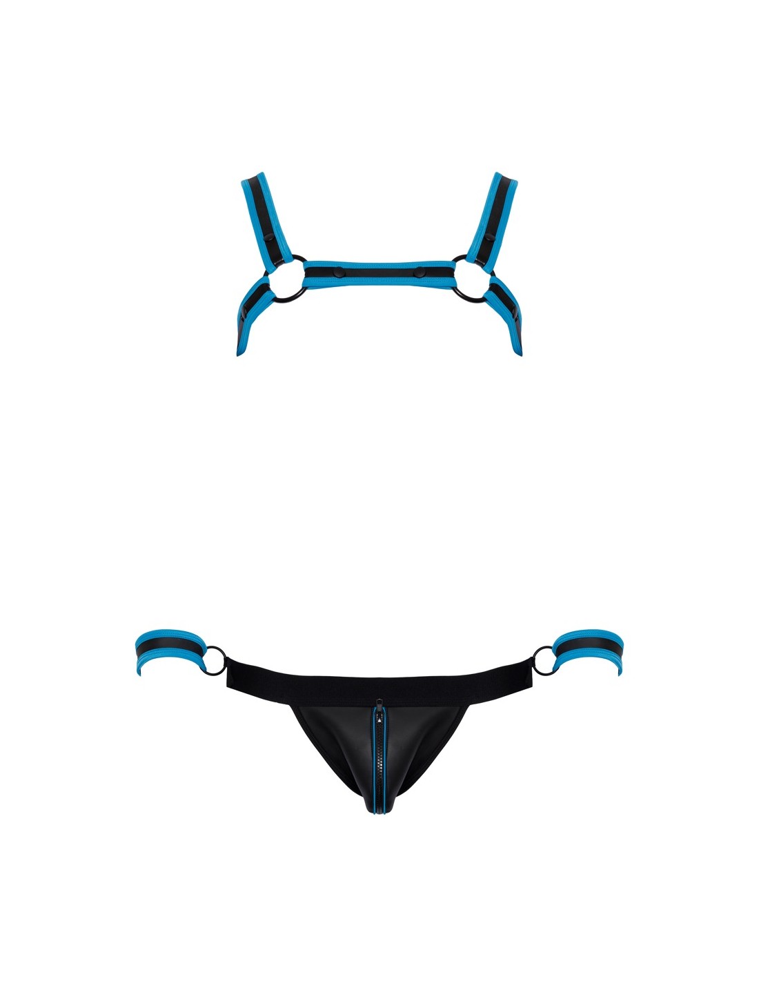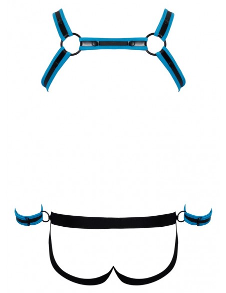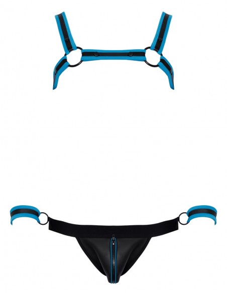 Pettorina, atleta e 2 manette in un set di Svenjoyment BONDAGE. Look stravagante in neoprene in nero con accenti blu reale. L'imbracatura può essere indossata e tolta rapidamente grazie ai bottoni a pressione. Il sospensorio con cerniera nella parte inferiore della custodia ha un invitante design aperto nella parte inferiore. La cintura ha un anello su ciascun lato per i polsini inclusi con chiusure a strappo regolabili.