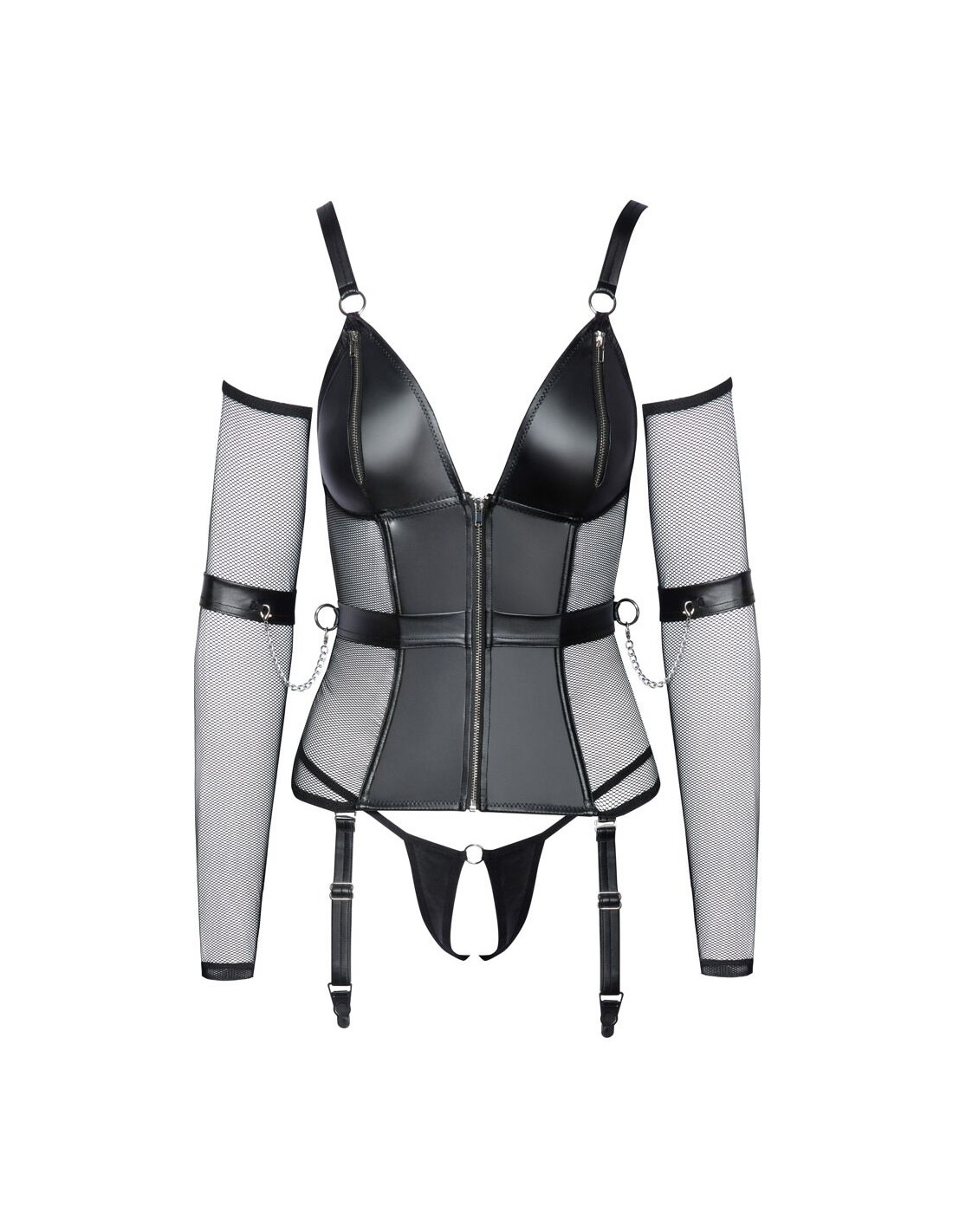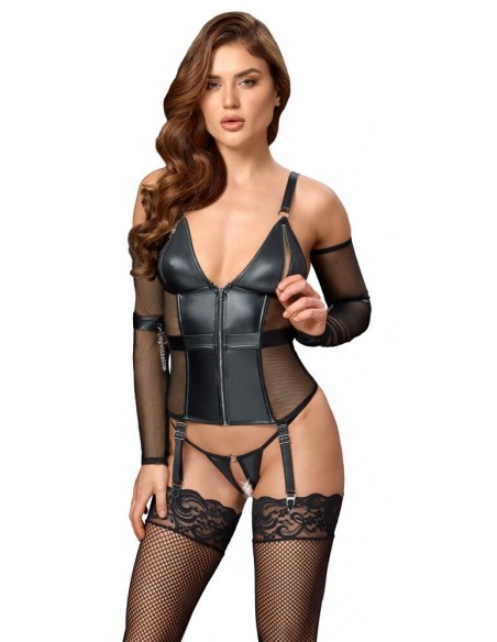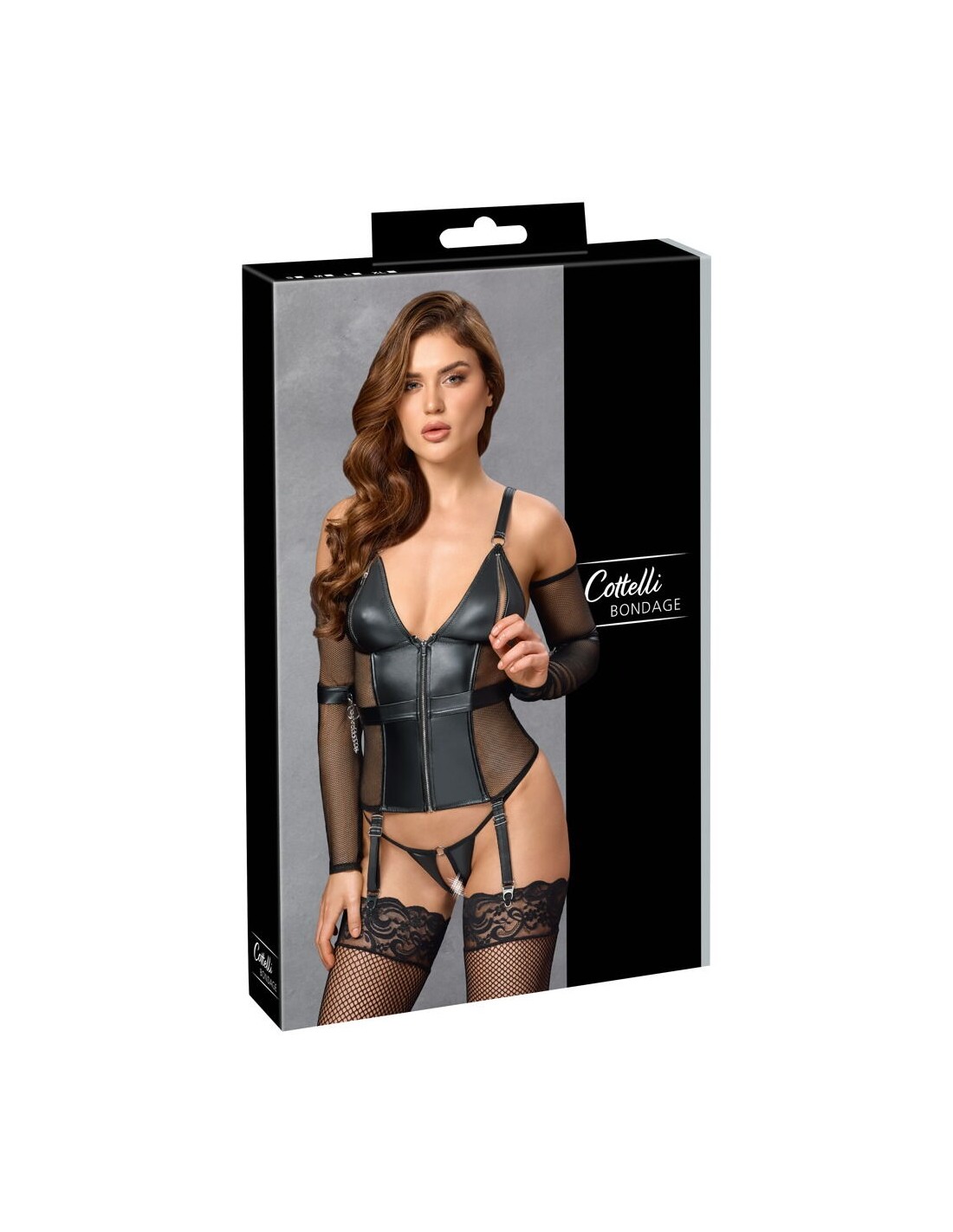 Set di lingerie Cottelli BONDAGE con camicia con reggicalze, perizoma inguinale, scaldabraccia e polsini. Mix di materiali eleganti ed elasticizzati in look opaco con rete e accessori color argento. Reggicalze con cerniera a tutta lunghezza sul davanti e cerniere nelle coppe sagomate. Con ossa sagomate per una vestibilità perfetta. Le spalline larghe possono essere regolate per adattarsi. Sul lato della cintura e sul retro è presente un anello per agganciare i polsini delle braccia con catene a moschettone. Le cavigliere possono essere indossate rapidamente con le loro chiusure in velcro e regolate per adattarsi. Le bretelle regolabili sono completamente rimovibili. Gli scaldabraccia lunghi e morbidi in rete e la stringa inguinale in look opaco completano l'accattivante completo.