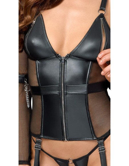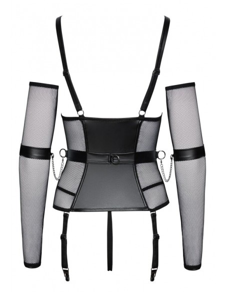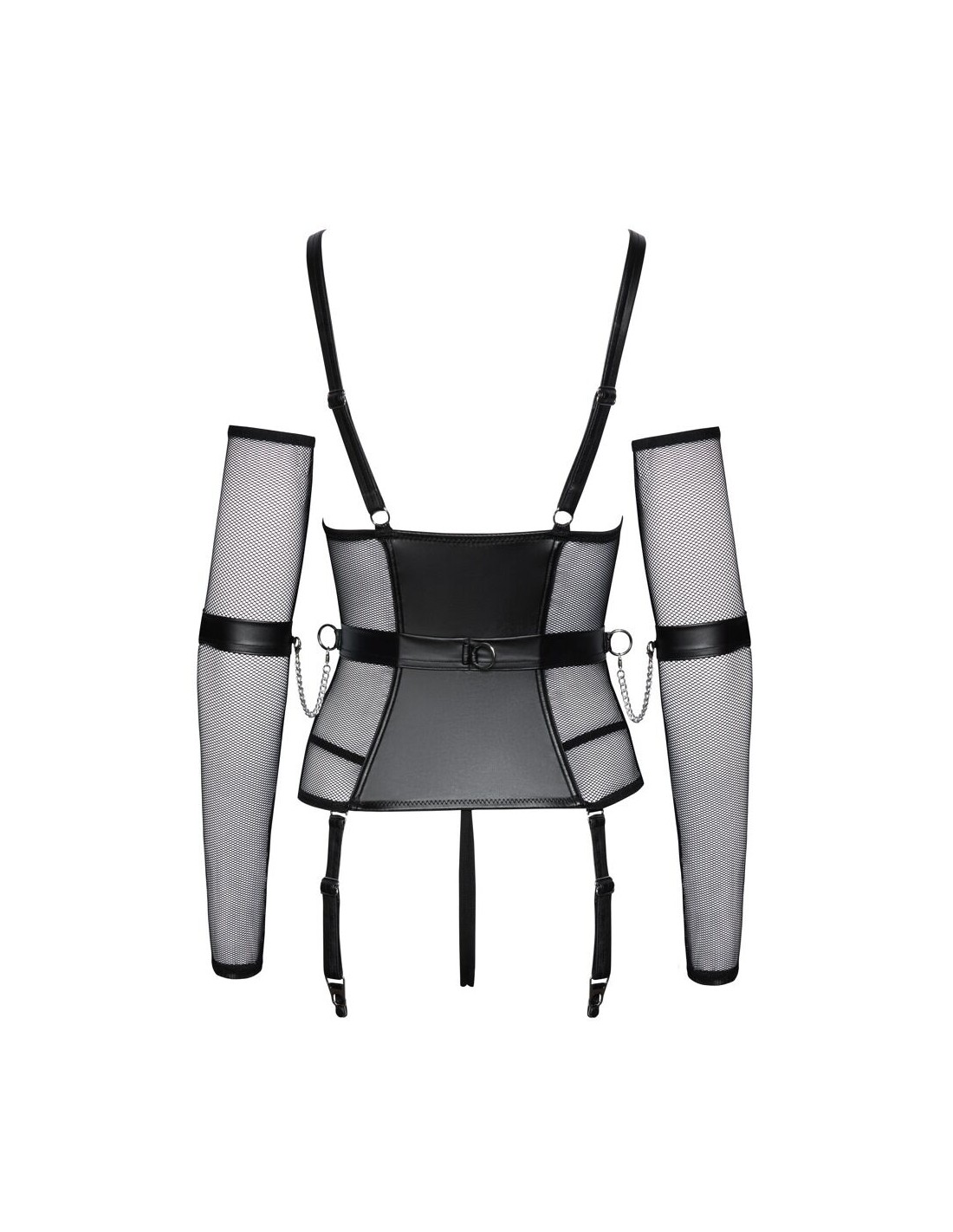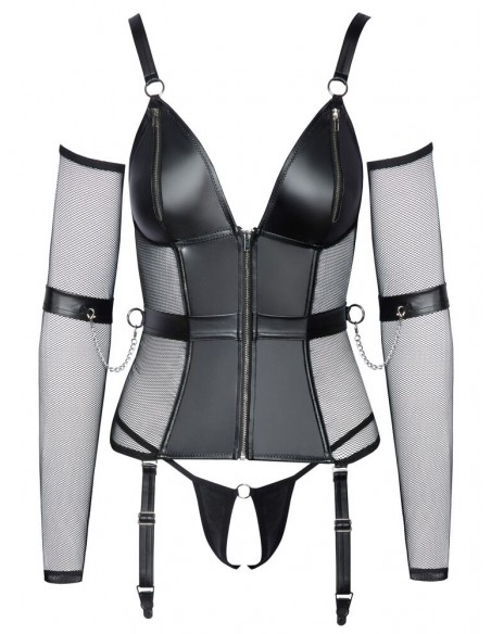 Set di lingerie Cottelli BONDAGE con camicia con reggicalze, perizoma inguinale, scaldabraccia e polsini. Mix di materiali eleganti ed elasticizzati in look opaco con rete e accessori color argento. Reggicalze con cerniera a tutta lunghezza sul davanti e cerniere nelle coppe sagomate. Con ossa sagomate per una vestibilità perfetta. Le spalline larghe possono essere regolate per adattarsi. Sul lato della cintura e sul retro è presente un anello per agganciare i polsini delle braccia con catene a moschettone. Le cavigliere possono essere indossate rapidamente con le loro chiusure in velcro e regolate per adattarsi. Le bretelle regolabili sono completamente rimovibili. Gli scaldabraccia lunghi e morbidi in rete e la stringa inguinale in look opaco completano l'accattivante completo.