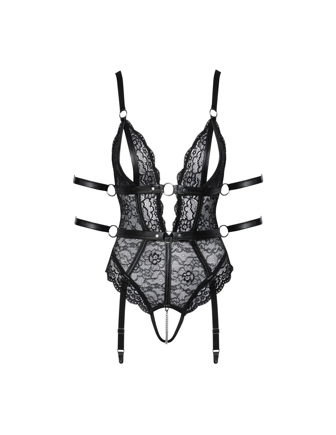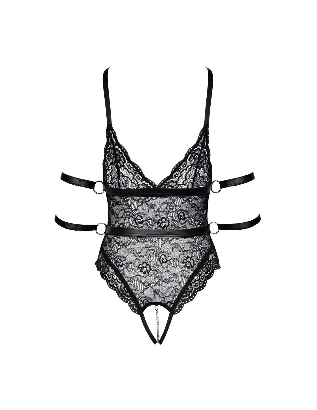 Body oversize in pizzo di Cottelli BONDAGE con 2 bretelle rimovibili e 4 cinturini alla caviglia. Realizzato in morbido pizzo nero elasticizzato con dettagli di cinghie dall'aspetto opaco e accessori color argento. Scollato davanti e dietro. Coppe morbide con spacchi seducenti. Catena stimolante rimovibile nel cavallo completamente aperto. Cinghie di cintura cucite sotto il seno e in vita, con anelli laterali attraverso i quali si possono tirare i 4 polsini alla caviglia. Le morbide cavigliere possono essere indossate e tolte rapidamente grazie a chiusure in velcro. Le due bretelle sono regolabili e completamente rimovibili.