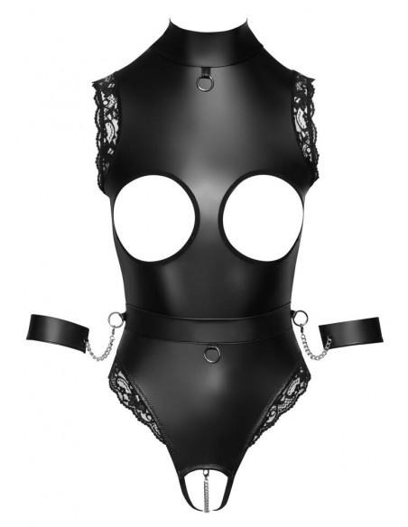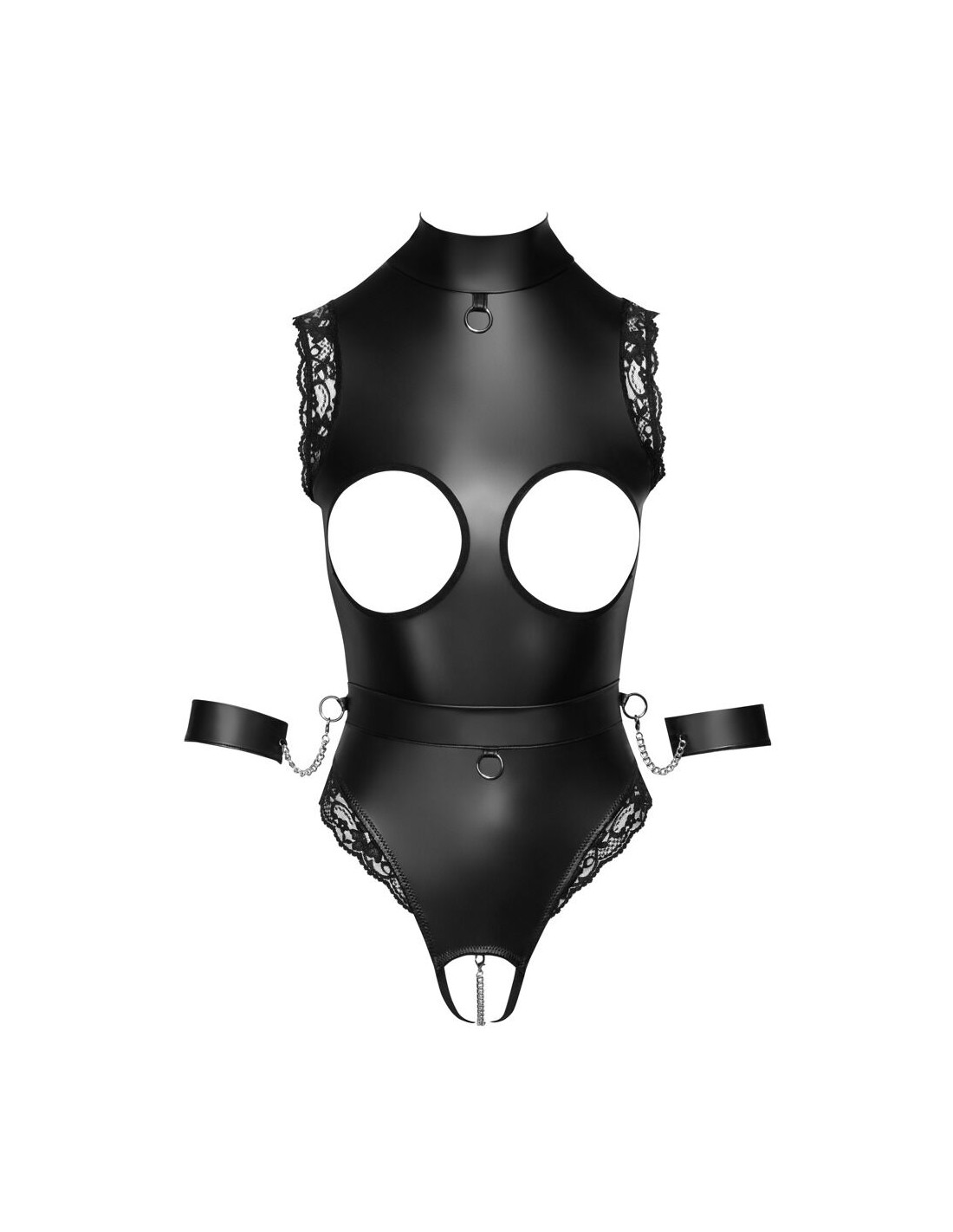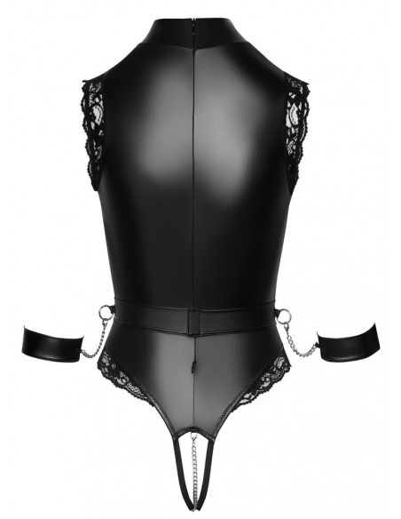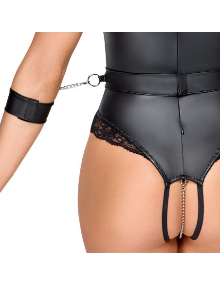 Body inguinale senza maniche di Cottelli BONDAGE con cintura rimovibile alla caviglia. In look nero, elasticizzato, morbido e opaco, con decorazioni in pizzo sulle aperture delle braccia e delle gambe e accessori color argento. Collo alto, con anello bondage sul davanti del colletto. Eccitante senza busto (cut-out) e con una catena stimolante rimovibile nel cavallo aperto. Con una lunga cerniera a 2 vie accuratamente integrata nella parte posteriore. I polsini per le braccia con catene a moschettone possono essere agganciati alla cintura in vita con anelli bondage. La cintura e le morbide cavigliere possono essere indossate e tolte rapidamente grazie alle loro chiusure in velcro regolabili.