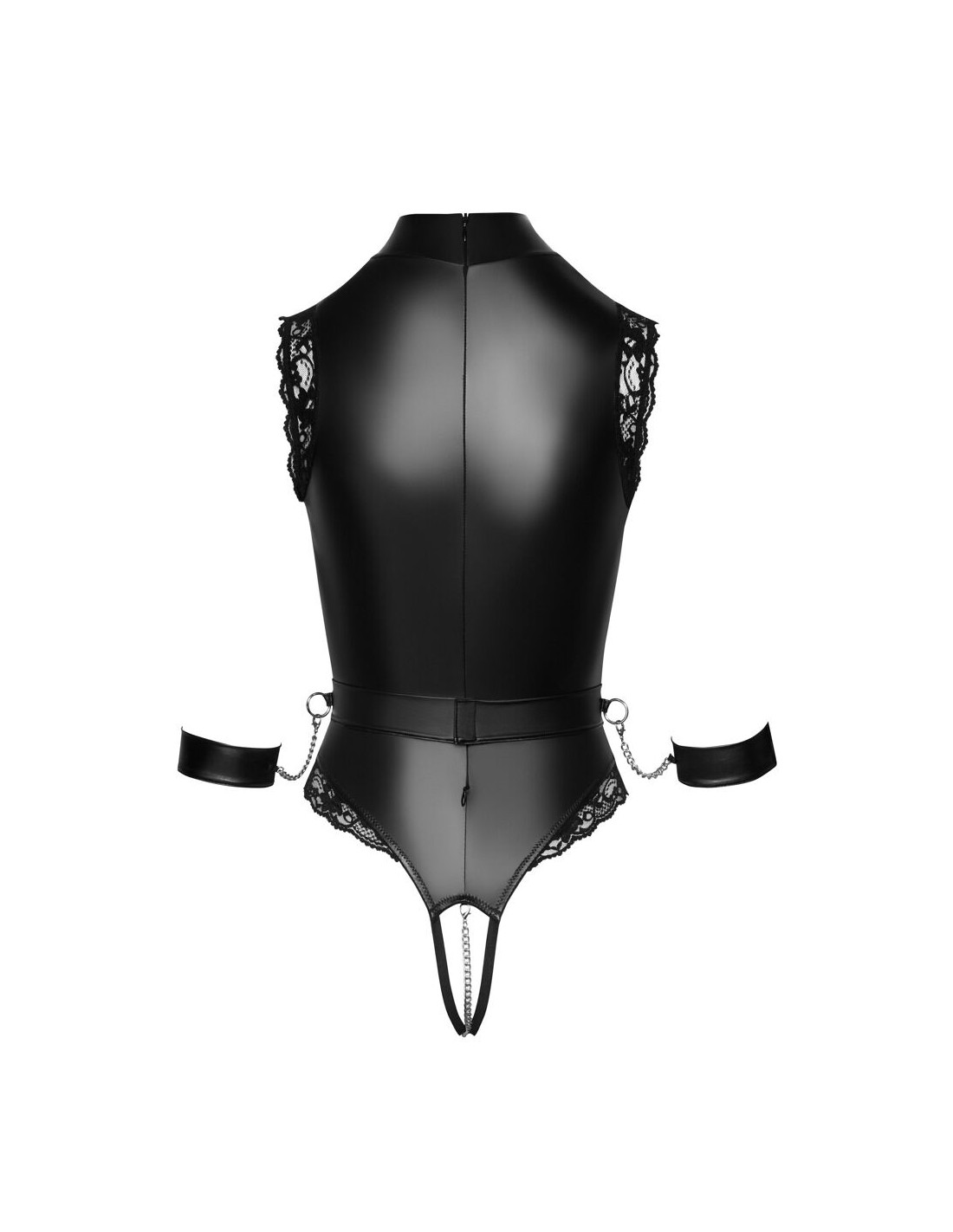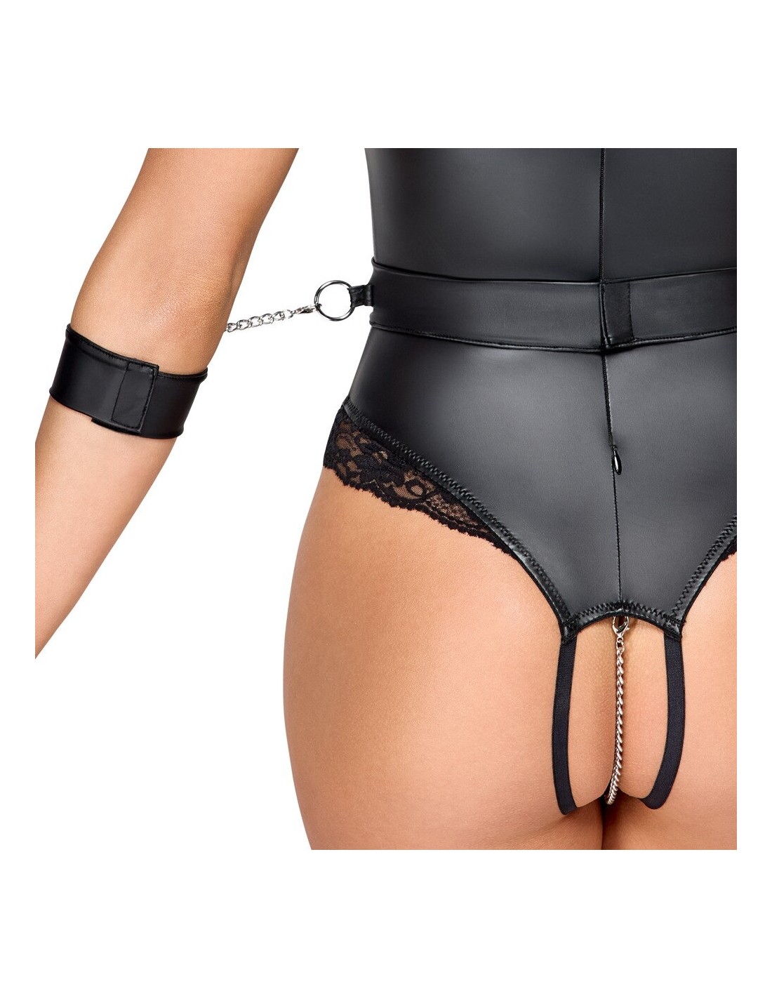 Body inguinale senza maniche di Cottelli BONDAGE con cintura rimovibile alla caviglia. In look nero, elasticizzato, morbido e opaco, con decorazioni in pizzo sulle aperture delle braccia e delle gambe e accessori color argento. Collo alto, con anello bondage sul davanti del colletto. Eccitante senza busto (cut-out) e con una catena stimolante rimovibile nel cavallo aperto. Con una lunga cerniera a 2 vie accuratamente integrata nella parte posteriore. I polsini per le braccia con catene a moschettone possono essere agganciati alla cintura in vita con anelli bondage. La cintura e le morbide cavigliere possono essere indossate e tolte rapidamente grazie alle loro chiusure in velcro regolabili.