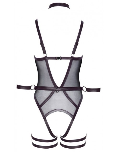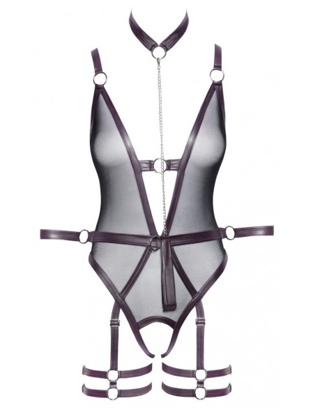 Corpo inguinale Cottelli BONDAGE con reggicalze e bretelle rimovibili. Sono inclusi anche un collare con guinzaglio a catena e due polsiere per giochi soft bondage! Corpo in powernet nero con dettagli decorativi in viola scuro opaco e accessori color argento. Scollato davanti e dietro e seducentemente aperto sul cavallo. Chiusura con gancio sul retro e spalline regolabili. La fascia in vita è dotata di anelli per i due polsini delle braccia. Le cavigliere possono essere indossate rapidamente con le loro chiusure in velcro e regolate a piacere. Così come il collare chiuso con la catena a moschettone staccabile come guinzaglio di guida. Anche le bretelle regolabili e le doppie cinghie per le cosce sono completamente rimovibili.