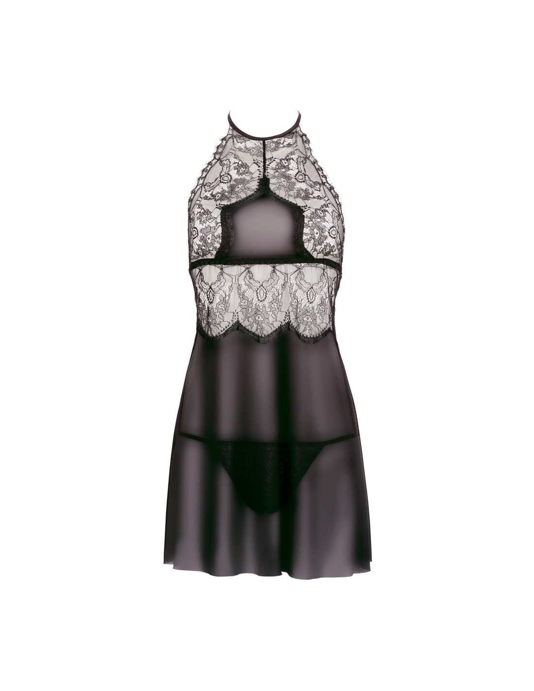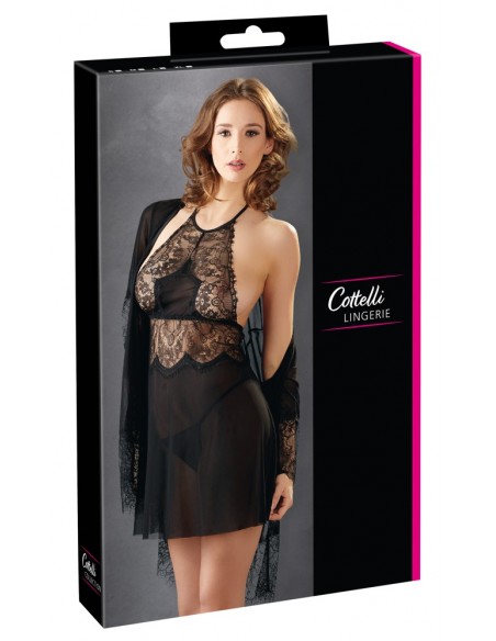 Con questo set sei perfettamente vestita per una serata erotica! Mentre la gonna è fatta di powernet nero, l'uso su larga scala di pizzo a ciglia nella parte superiore fornisce un look nobile - un inserto powernet sulla scollatura migliora questo effetto. E grazie alla trasparenza vaporosa del pizzo, anche i due argomenti migliori lampeggiano: che spettacolo! Ma anche la vista posteriore sa come convincere, perché il negligee è dotato di un piccolo halterneck da legare e sotto la schiena libera l'inserto di pizzo è continuato. Il kimono colpisce anche per il suo materiale trasparente e per un altro colpo d'occhio - sia i polsini che l'ampio orlo sono fatti di sensuale pizzo di ciglia e forniscono così un effetto wow. Perizoma incluso.