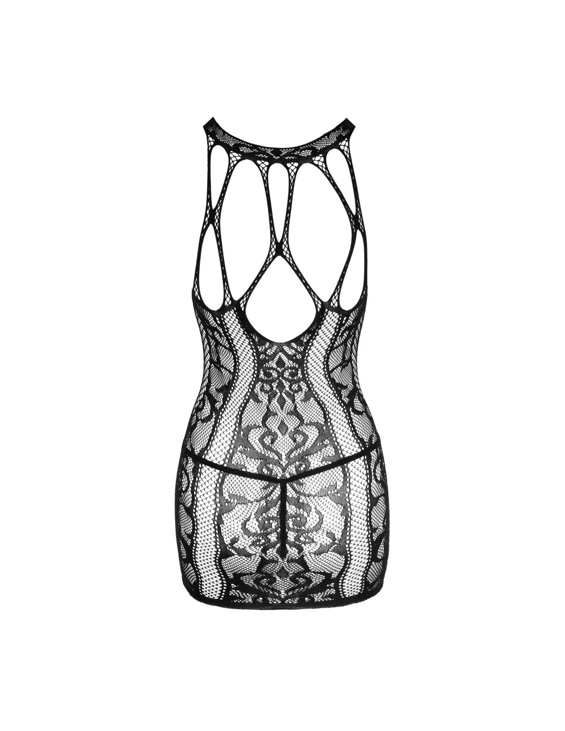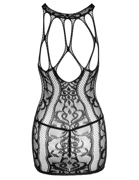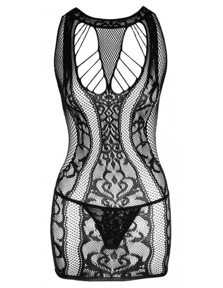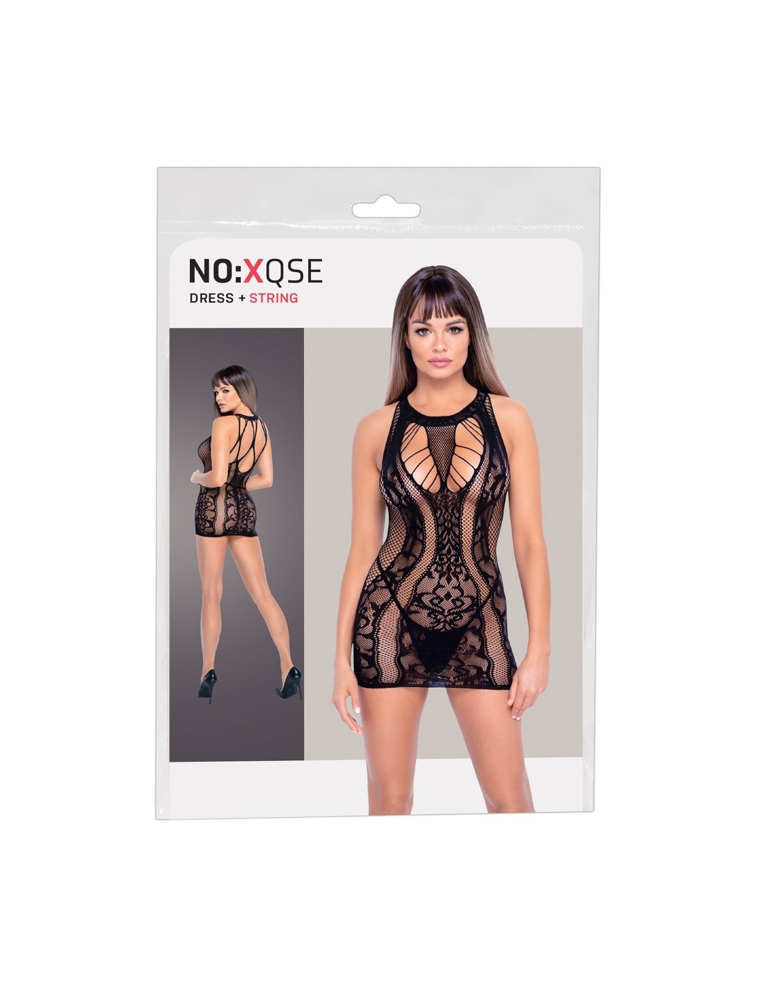 Vestiti in vari look a rete con ornamenti intrecciati di NO:XQSE, compreso il perizoma di pizzo. Tutto fatto senza cuciture e meravigliosamente morbido ed elastico per un alto comfort di vestibilità. Ritagli sul décolleté decorati con fasce elastiche. Look stravagante sul retro fatto di fasce elastiche e rete.