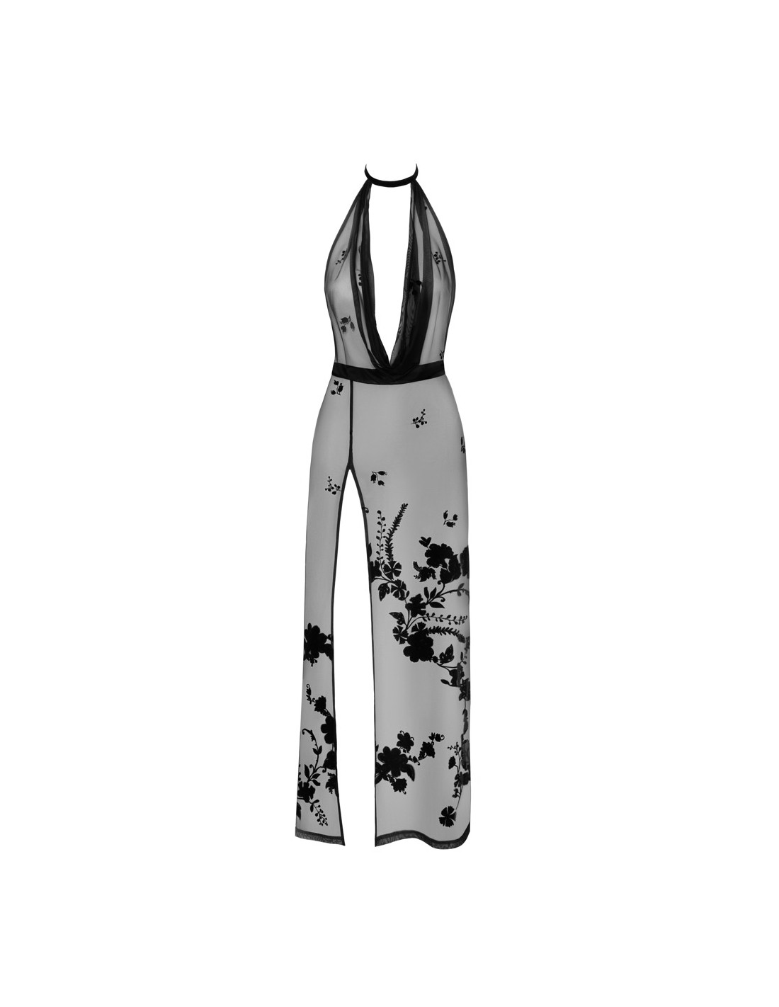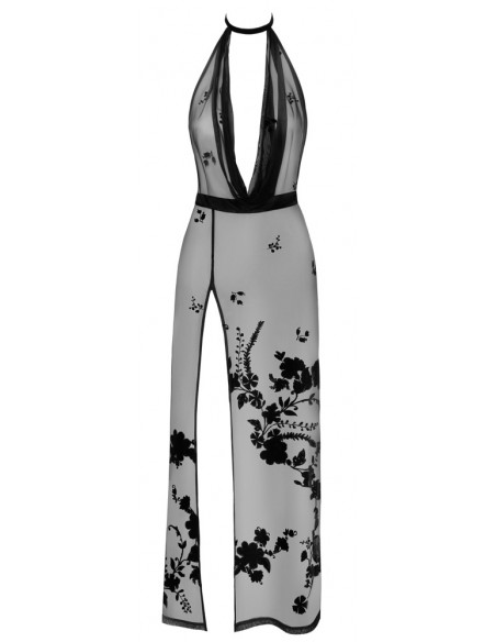 Abito lungo off-the-shoulder di Noir, interamente realizzato in sottile rete elasticizzata nera con stampa flock in velluto dall'aspetto di viticci floreali. Profonda scollatura a cascata sul davanti sotto lo stretto halterneck con chiusura a gancio. Eccitante spacco fino ai fianchi. Aperto sul retro fino al sedere!