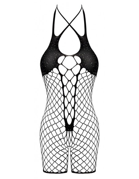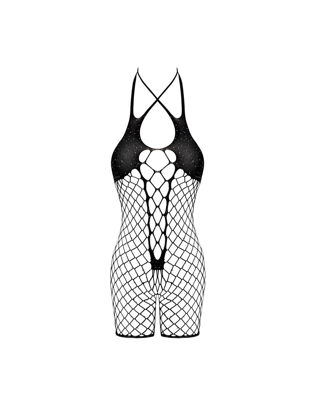 Body crotchless senza schienale di Cottelli FANTASY con gambe corte. Realizzato in morbida rete nera, con aspetto diverso sul davanti. Incrostato dappertutto con strass scintillanti. Realizzato senza cuciture ed elasticizzato per un elevato livello di comfort. Seducente apertura sul cavallo. Il doppio collo alto elasticizzato può essere indossato anche incrociato sulla scollatura.