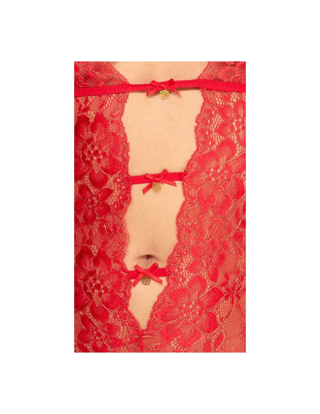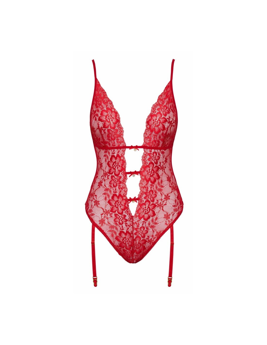 Seducente reggicalze da baciare completamente realizzato in pregiato pizzo rosso con riflessi e dettagli color oro. Morbido ed elastico su tutto il perimetro per il massimo comfort. Scollato in vita sul davanti, le 3 bretelle di collegamento sono decorate con piccoli fiocchi e pietre scintillanti al centro. Retro in due pezzi (reggiseno e slip con reggicalze). Chiusura con piccolo gancio sul retro. Le spalline e le bretelle sono regolabili.