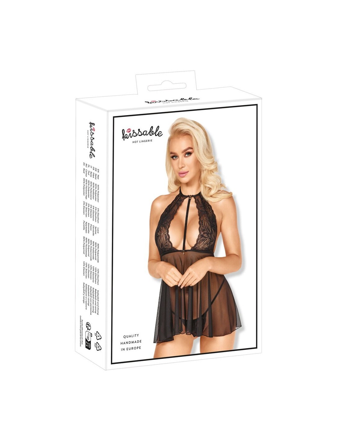 Babydoll corto e svasato di kissable in trasparenza nera, realizzato in splendido pizzo (top) e pregiato powernet (gonna). Morbido come la seta ed elastico per un elevato comfort di vestibilità. Sul davanti con una generosa scollatura dal collo alla fascia in vita, al centro una barra di nastro di raso come richiamo visivo. Anche il collo e la fascia in vita sono in raso, ciascuno decorato con un piccolo fiocco e una gemma scintillante sul davanti. Senza schienale, con collo a farfalla e chiusura al collo. Il piccolo perizoma in pizzo è incluso.