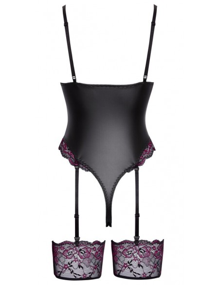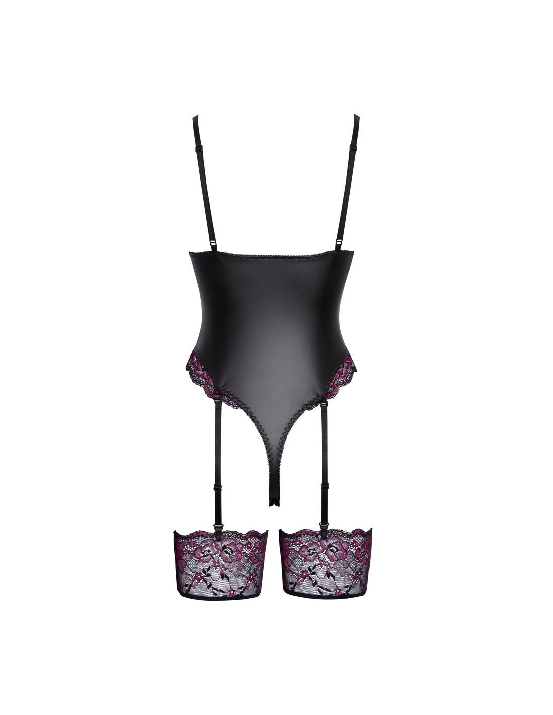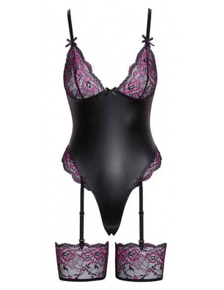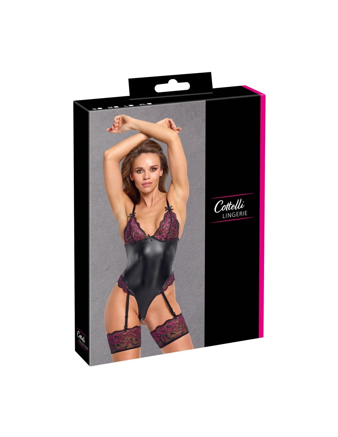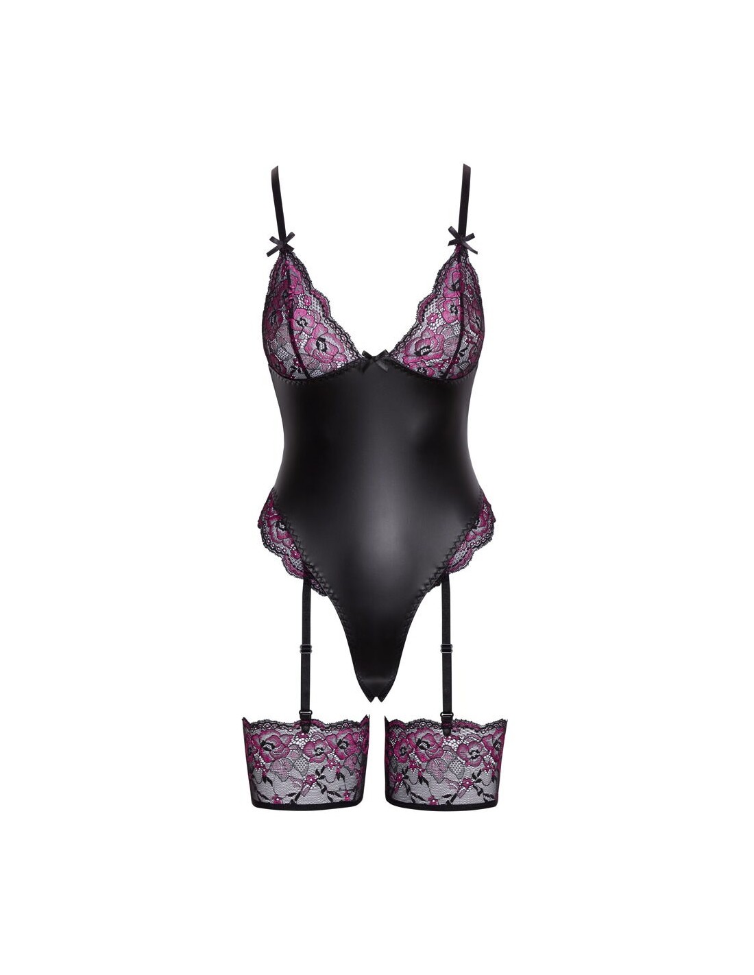 Bellissimo body reggicalze di Cottelli LINGERIE con bretelle e reggicalze rimovibili. Elegante look nero opaco mescolato a raffinato pizzo bicolore rosa e nero, decorato con piccoli fiocchi decorativi neri. Body stile Rio, morbido ed elastico, con coppe in morbido pizzo e spacchi per le gambe altissimi decorati con pizzo. Con pratica chiusura a pressione sul cavallo. Le bretelle rimovibili e le spalline possono essere regolate per adattarsi. Le larghe bretelle in pizzo elasticizzato possono essere indossate anche senza bretelle.