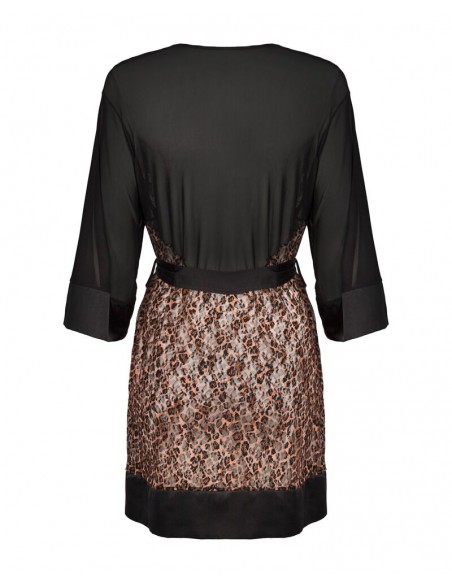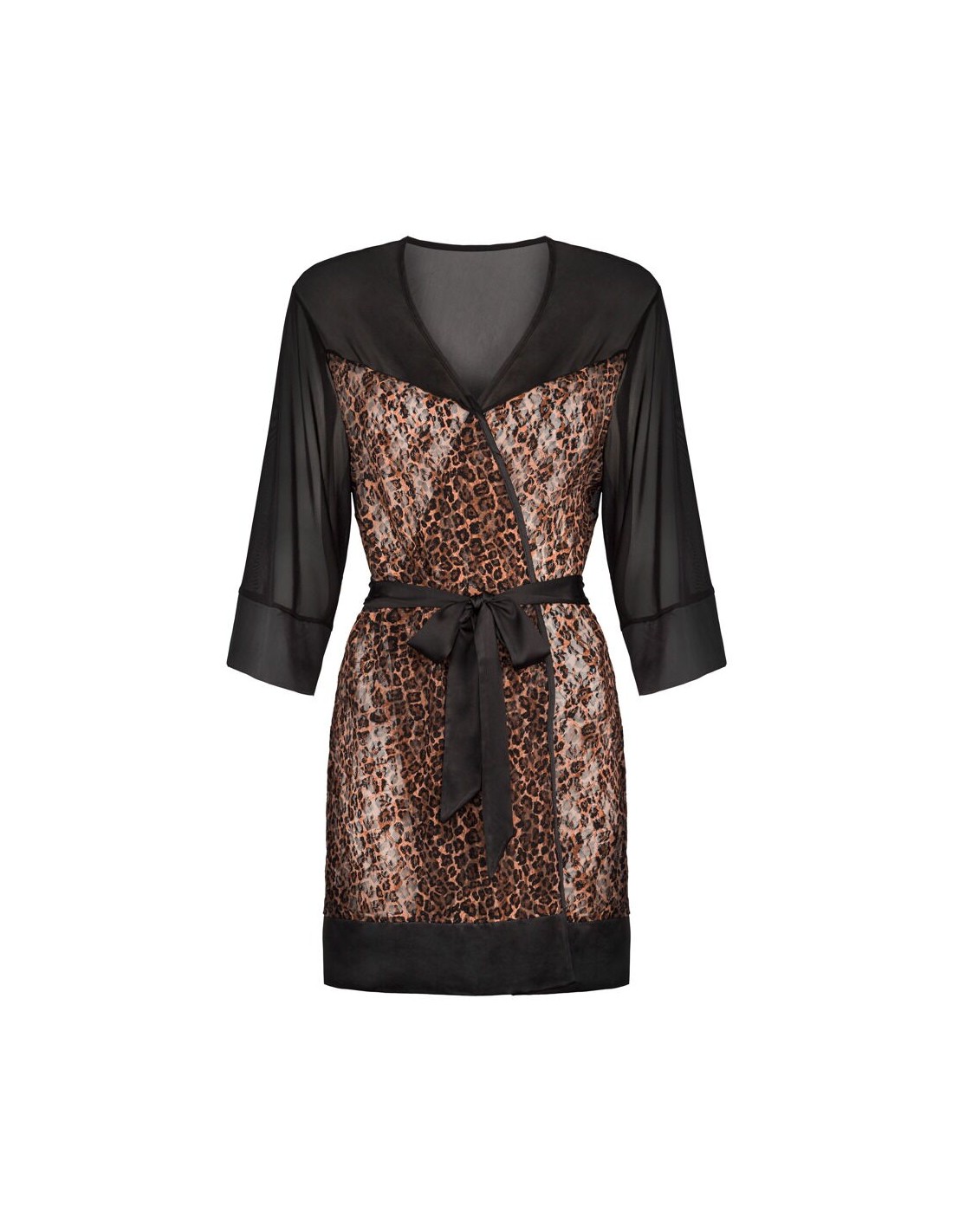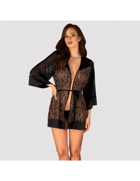Il kimono Allunes di Obsessive è un gioiello per il corpo femminile durante o dopo una notte di passione. Il tessuto semitrasparente in nero e con stampa leopardata animalista lascia intravedere curve eccitanti e seduce con più di una carezza.