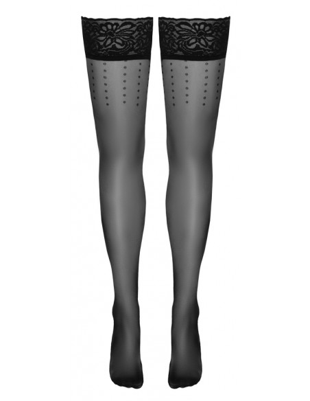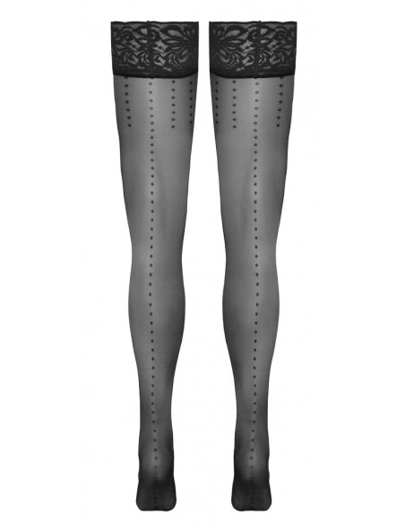 Calze autoreggenti nere di Cottelli LEGWARE con pois sulle cosce e cucitura puntinata dietro. Bellissimo bordo in pizzo largo 9 cm con rinforzo in silicone all'interno per una vestibilità antiscivolo e un sostegno ottimale. Piede preformato. Peso del filato 20 den. Certificato Oeko-Tex.