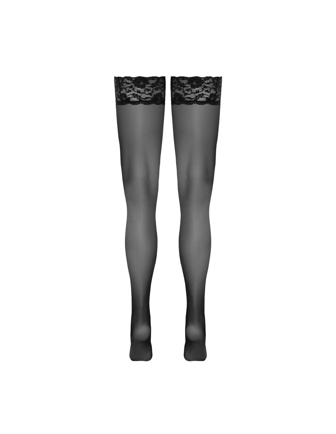 Calze nere autoreggenti di Cottelli LEGWARE con un bellissimo top in pizzo largo 9 cm. Interno con rinforzo in silicone per una vestibilità antiscivolo e una tenuta ottimale. Misura del filo 20 den. Certificato Oeko-Tex.