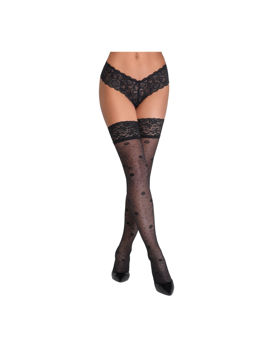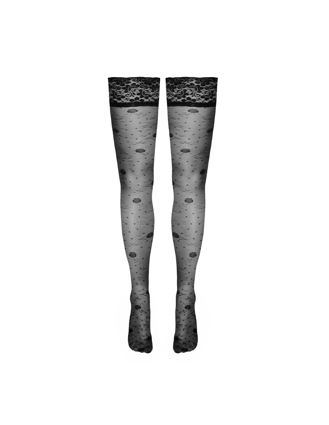 Calze autoreggenti nere di Cottelli LEGWARE con delicata fantasia di rose. Con bordo in pizzo largo 9 cm e rinforzo in silicone per una vestibilità antiscivolo e un sostegno ottimale. Piede leggermente preformato. Peso del filato 20 den. Certificato Oeko-Tex.
