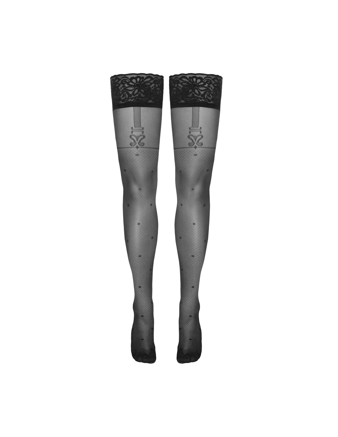 Calze autoreggenti nere di Cottelli LEGWARE in delicato design a rete con pois e bretelle intrecciate. Bellissimo bordo in pizzo largo 8 cm con rinforzo in silicone all'interno per una vestibilità perfetta e antiscivolo. Piedi leggermente preformati. Peso del filato 40 den. Certificato Oeko-Tex.