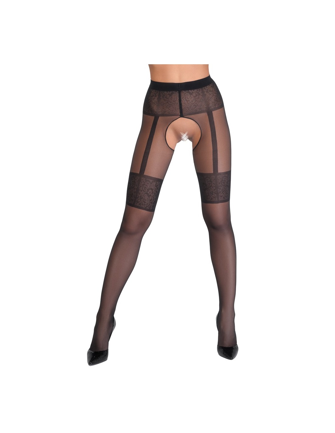 Collant neri senza cavallo di Cottelli LEGWARE con reggicalze intrecciato e reggicalze larghi in un elegante look in pizzo. Il cavallo è molto aperto, i piedi leggermente preformati. Peso del filato 20 den. Certificato Oeko-Tex.