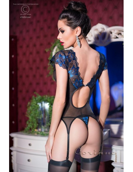 Elegante guepiere in morbido tulle nero con maniche corte ad aletta, 4 reggicalze regolabili ed ampio inserto in pizzo nero/blu lungo tutta la fascia superiore. Scollo a V su entrambi i lati con ampia apertura sulla schiena valorizzata da un grazioso bijoux con strass. Comprende tanga in coordinato.