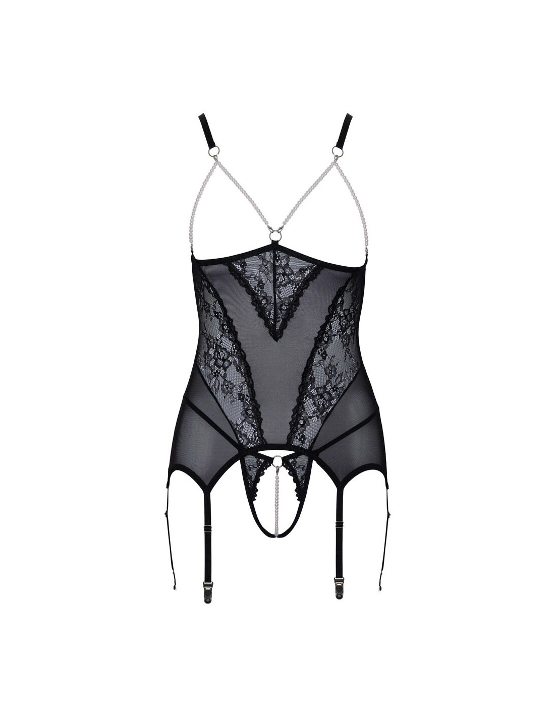 Chemise con reggicalze e perizoma nero senza cavallo di Cottelli LINGERIE. Realizzato in pregiato powernet con delicati inserti in pizzo sul davanti. Morbido ed elastico su tutto il perimetro per un elevato comfort di utilizzo. Catene di perle bianche incorniciano in modo seducente i seni nudi e sono agganciate ad anelli decorativi con i loro moschettoni. Le spalline sono regolabili sulla schiena libera. Sul retro, la chemise con bretelle si chiude con un gancio. Le 6 bretelle sono regolabili in lunghezza. Il perizoma coordinato con pizzo aperto sul davanti è dotato di una stimolante catena inguinale rimovibile.