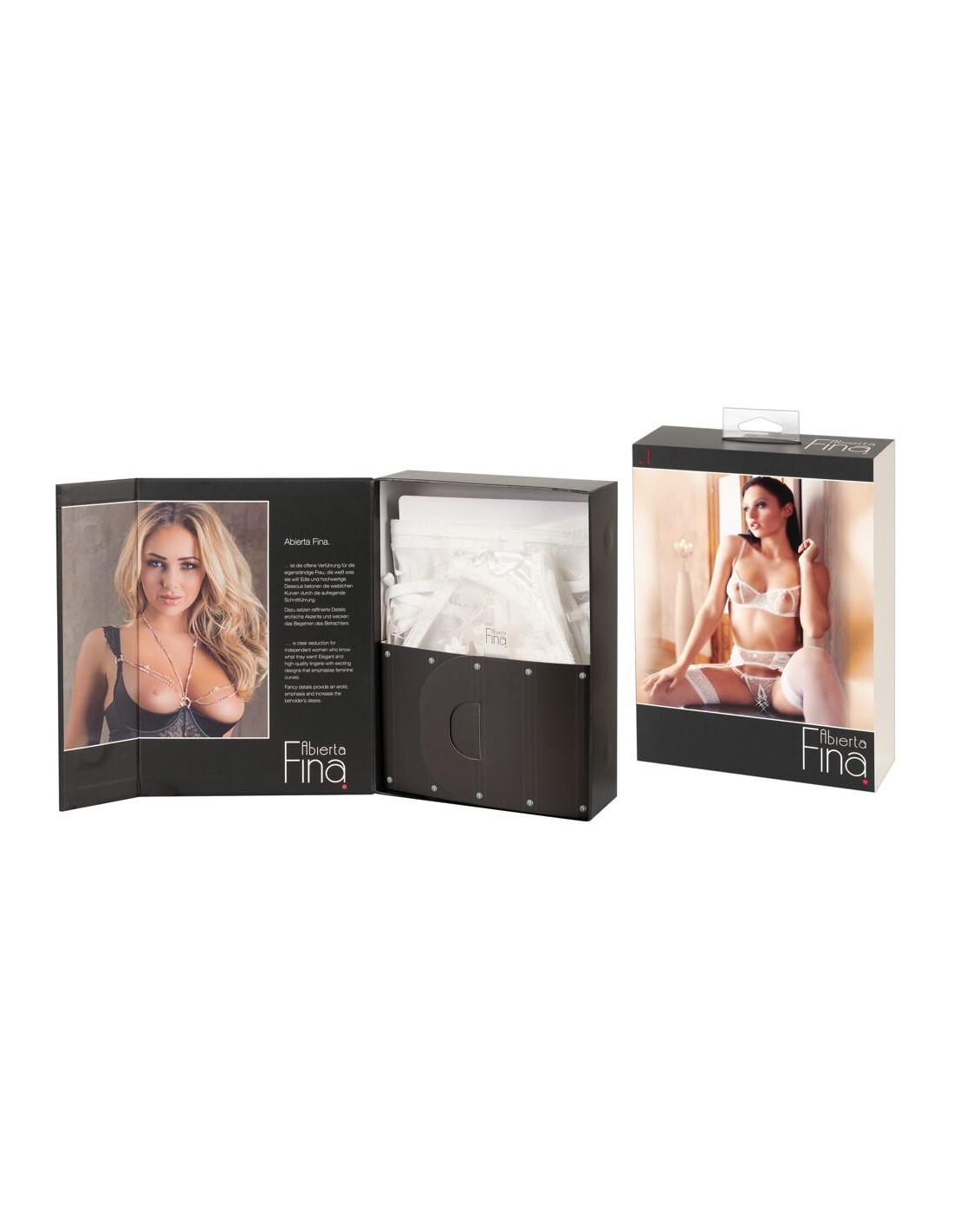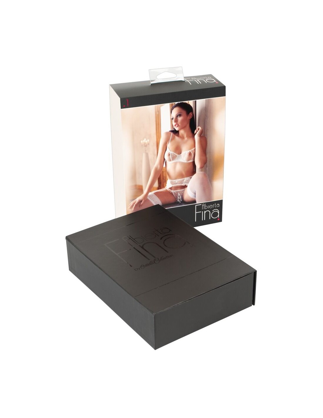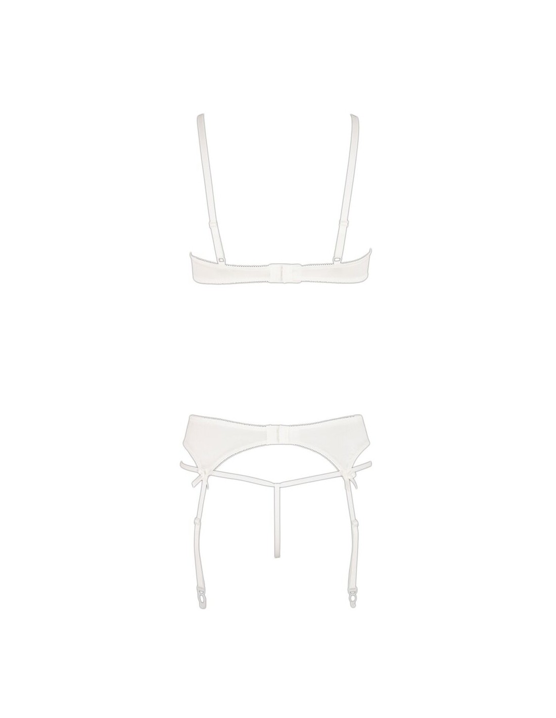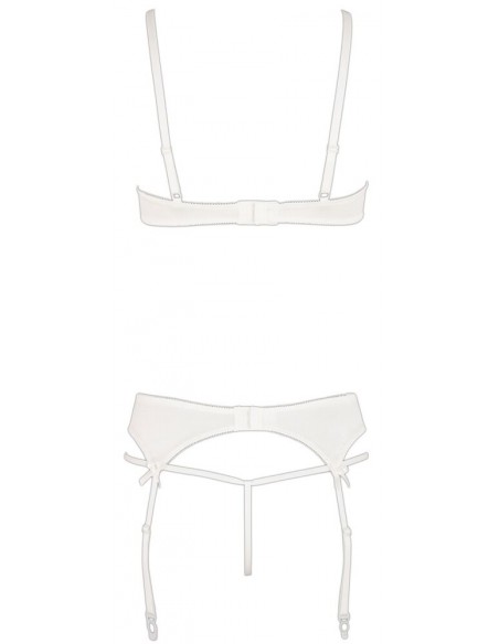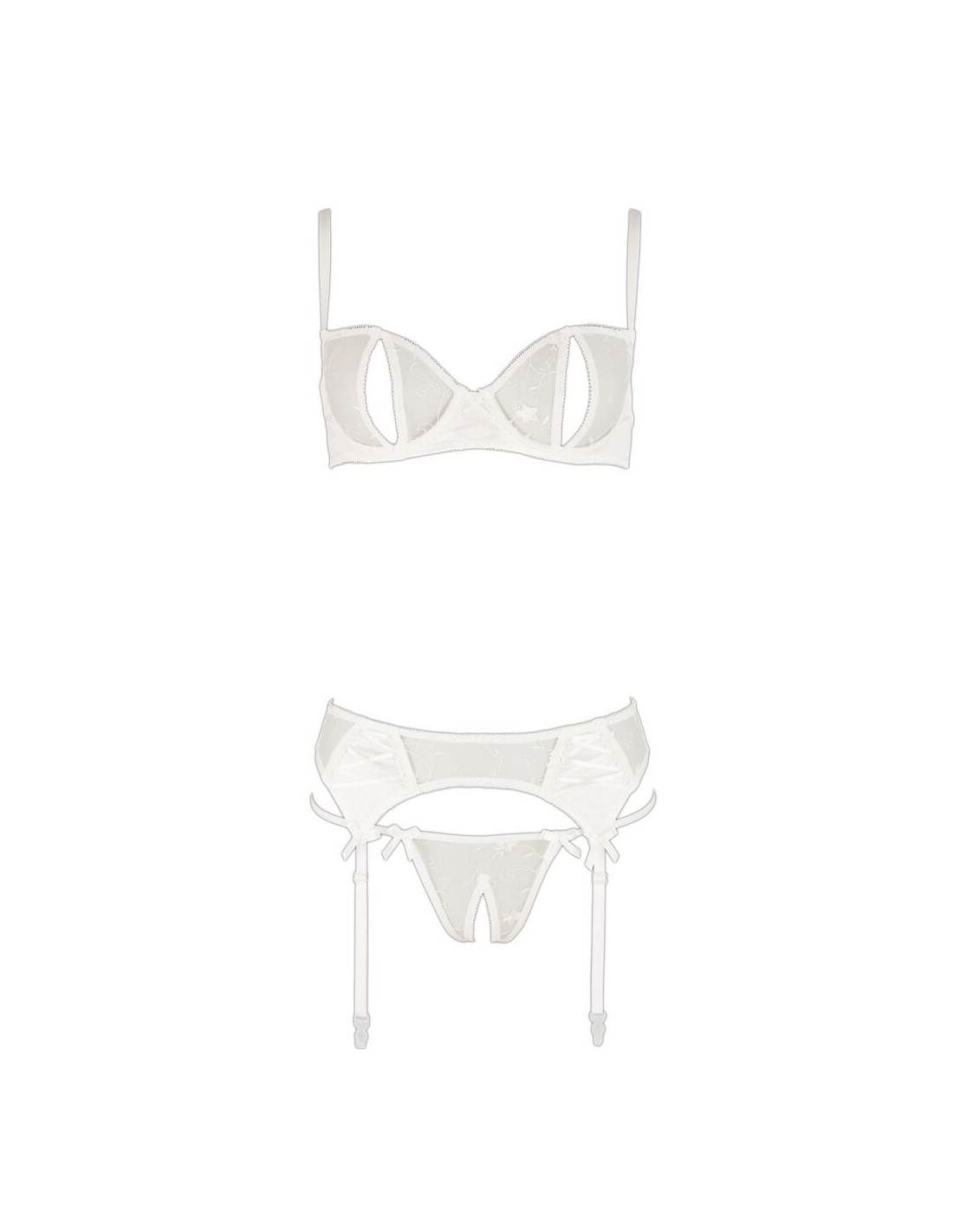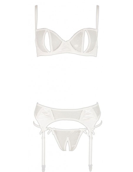 Set delicato fatto di maglia fine ricamata in combinazione con raso elastico e piccole allacciature decorative. Reggiseno con ferretto con coppe a spacco e spalline regolabili. Reggicalze con bretelle regolabili, chiusura a gancio sul retro. Perizoma abbinato con cavallo aperto.