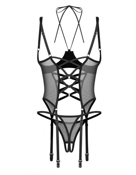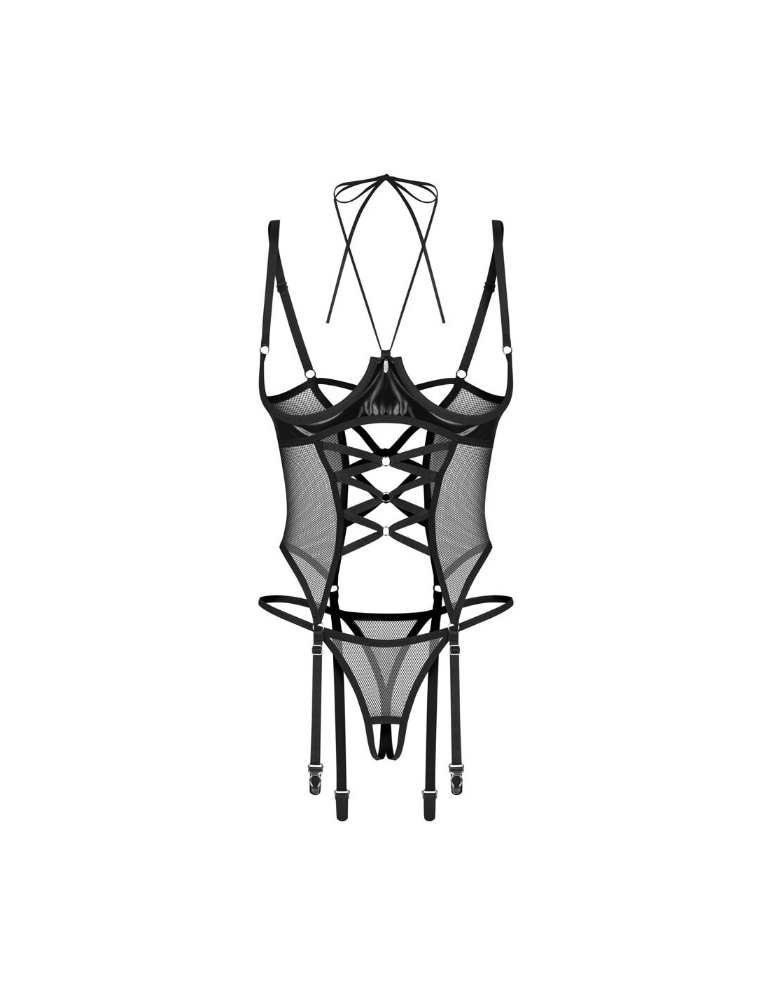 Reggicalze Dominna senza seno di Obsessive con perizoma inguinale. In un elegante mix di rete morbida e sottile e di un elegante effetto bagnato. Con allacciatura decorativa sul davanti e schiena aperta. Il collo stretto può essere allacciato. Con un piccolo elemento gioiello tra le coppe aperte. Le spalline e le due bretelle sul davanti sono regolabili. La seducente stringa inguinale completa l'eccitante duo overt.
