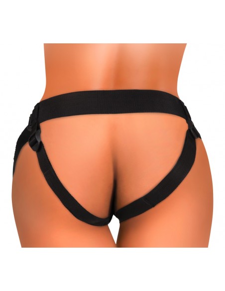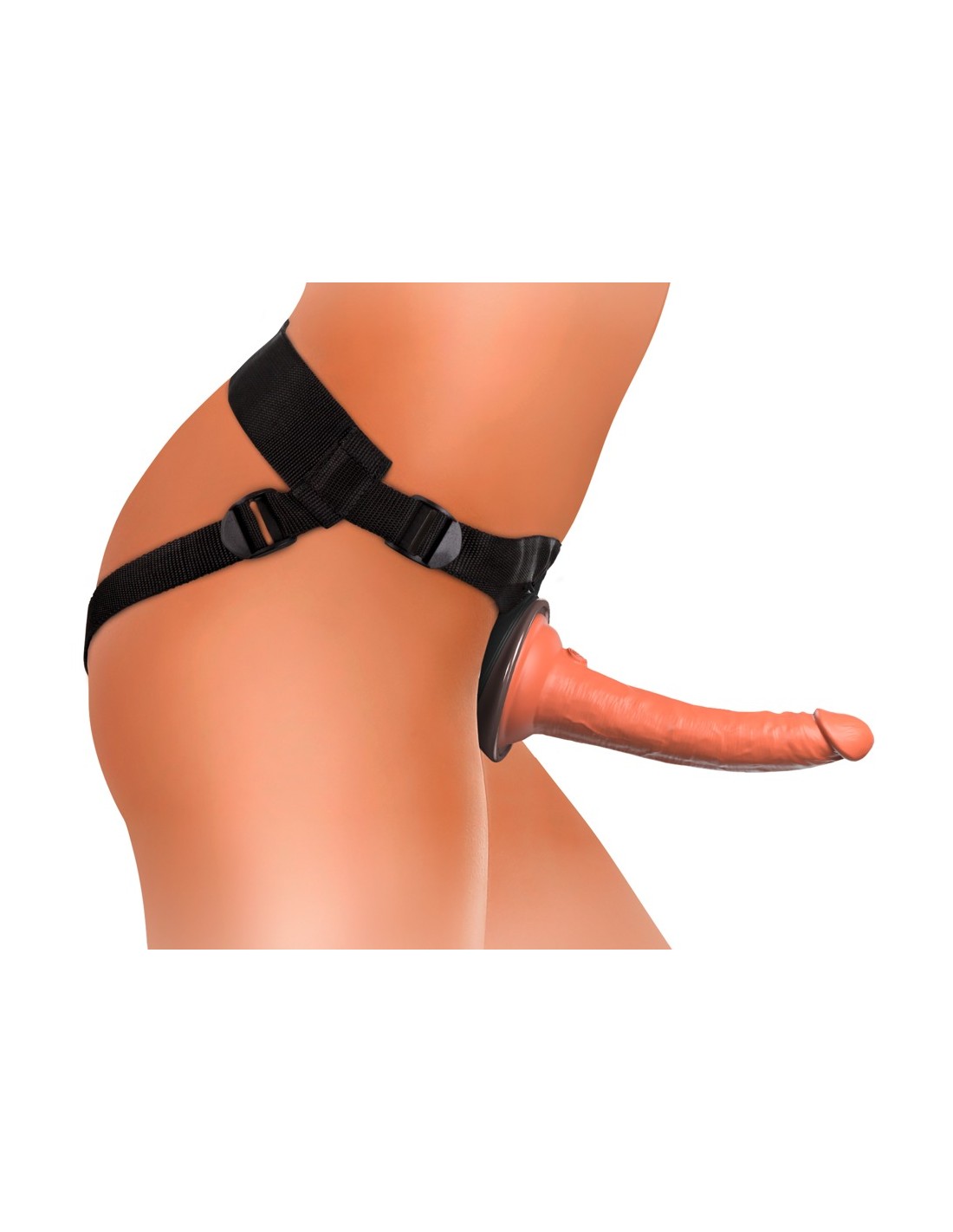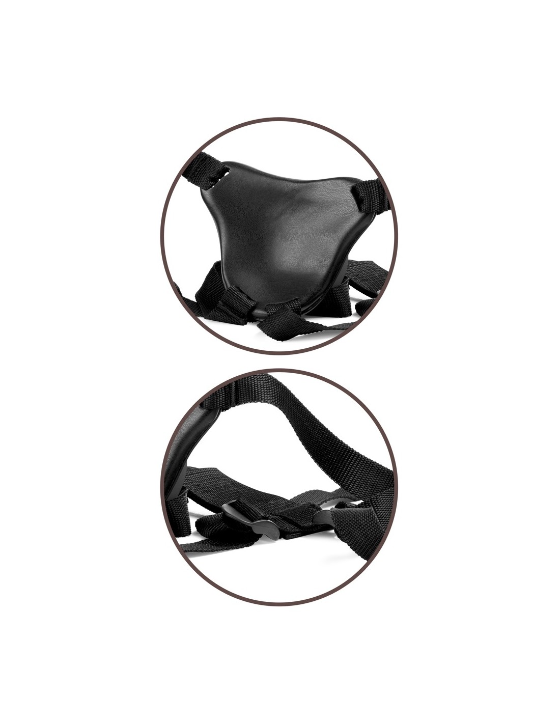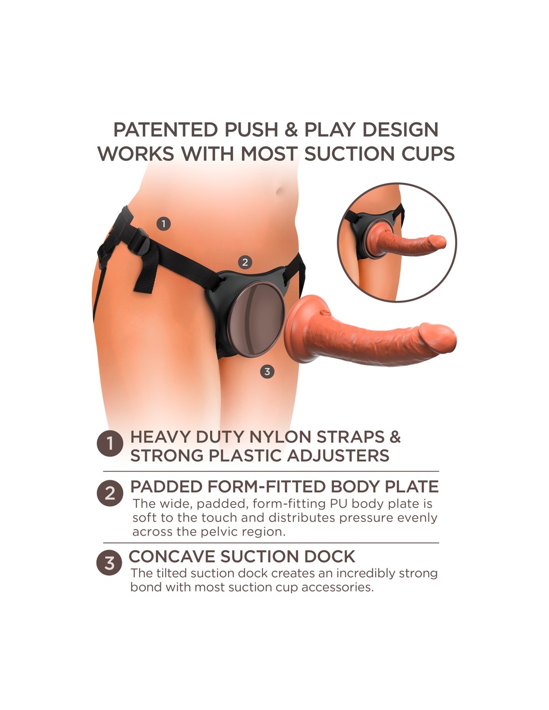 Il semplice sistema strap-on si basa sulla piastra del corpo anatomicamente curva con incavo di aggancio, in cui il piede di aspirazione del dildo è fissato/agganciato a prova di bomba e lo tiene in una posizione di spinta (Push & Play). La piastra del corpo morbidamente imbottita distribuisce la pressione in modo uniforme sulla zona pelvica, in modo da evitare una pressione puntuale e spiacevole. Le robuste cinghie larghe sono regolabili nella vestibilità con cursori in plastica per una vestibilità ferma e confortevole. Qualsiasi altro vibratore/dildo convenzionale con piede a ventosa può anche essere attaccato al/al body dock.