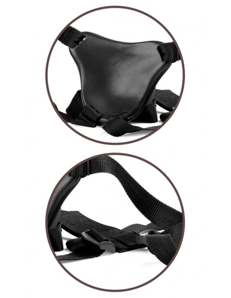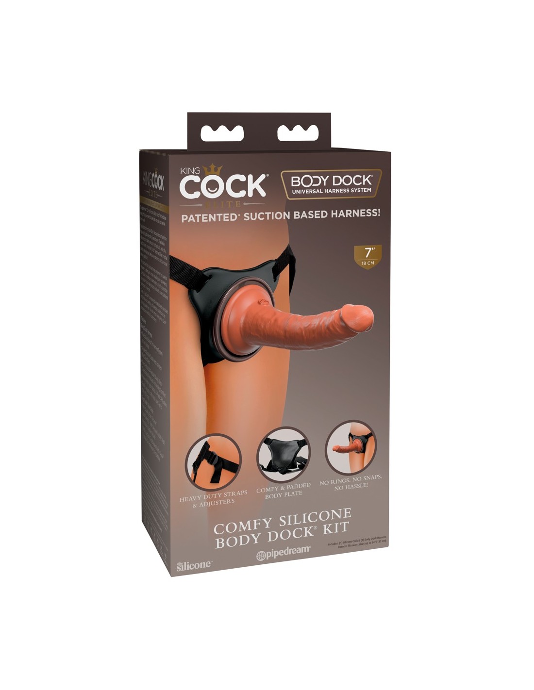 Il Comfy Silicone Body Dock Kit di King Cock Elite include il comodo strap-on Comfy Body Dock e il dildo molto realistico da 7" Dual Density Silicone Cock natural per un divertimento illimitato di pegging e i sogni di spinta lesbica diventano realtà.