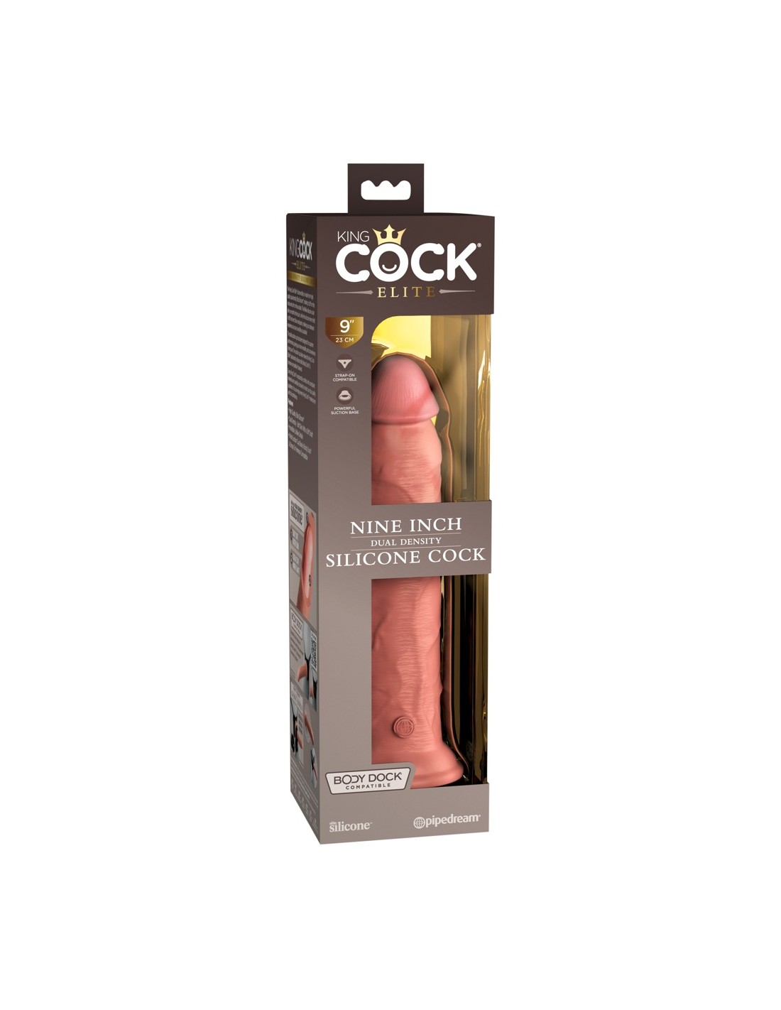 Il dildo ha una forte base a ventosa che si attacca saldamente e in modo sicuro a qualsiasi superficie liscia per un uso senza mani. Funziona perfettamente con il Body Dock Universal Harness System di King Cock Elite - ma è anche compatibile con altri strap-on e imbracature convenzionali.
