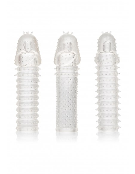 Il kit di estensione in 3 pezzi è un set di 3 maniche di estensione super strette e chiuse con una trama a coste dentro e fuori per una stimolazione intensa. Queste maniche rinforzanti ingrandenti si avvolgono strettamente per aumentare la circonferenza, la lunghezza e il piacere esplosivo per tutti i soggetti coinvolti. Il materiale ultra elastico della manica del potenziatore erotico e la spaziosa camera sono realizzati per adattarsi anche all'uomo più grande. Mentre ecciti il tuo amante con una maggiore circonferenza e stimolanti tickler, il potente supporto per l'erezione del potenziatore appagante e la camera strutturata danno risultati esplosivi per entrambi. La camera strutturata e il potenziatore dell'erezione forniscono una maggiore stimolazione e un potente supporto. Avvolgi il tuo strumento di piacere in questa custodia super elastica per aumentare facilmente la resistenza, la stimolazione e il piacere dell'orgasmo. Il potenziatore flessibile è costituito da un TPR igienicamente superiore. Questo materiale sicuro per il corpo è inodore e privo di ftalati per mantenere i tuoi punti più sensibili felici e sani