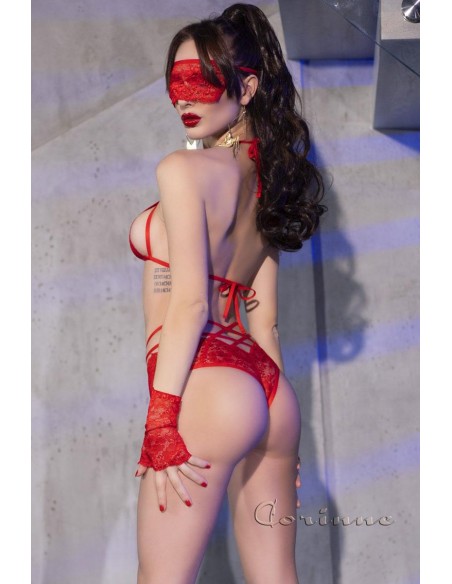 Completino intimo 4 pezzi in pizzo con guanti e benda. Rosso M