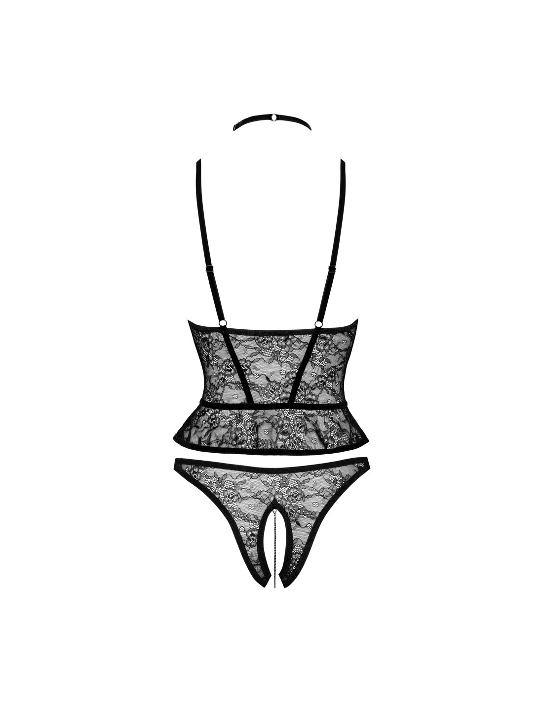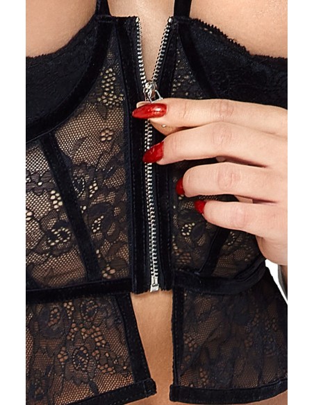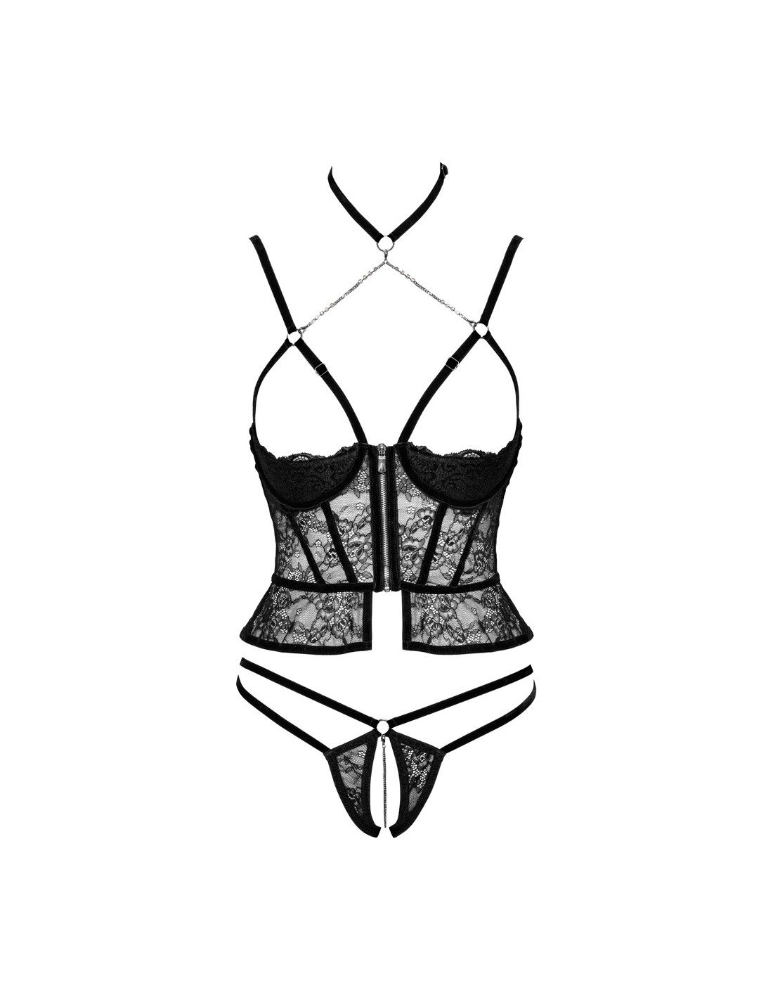 Un reggiseno lungo e mutandine senza cavallo sono combinati in questo set di Abierta Fina. Tutto è realizzato in delicato pizzo elastico morbido e adornato con strisce e dettagli in velluto. Il reggiseno lungo con coppe con ferretto leggermente imbottite porta il busto al top della forma e direttamente nel campo visivo. Una piccola balza accarezza la vita. La cerniera color argento sul davanti lo rende facile da indossare e da togliere. Le catene della scollatura e il girocollo sono staccabili dal reggiseno. Le cinghie della scollatura e le cinghie di velluto sono regolabili per adattarsi. Le mutandine in pizzo, sapientemente disegnate con bande elastiche sul davanti, seducono con il loro design senza cavallo e una catena stimolante che può anche essere rimossa.