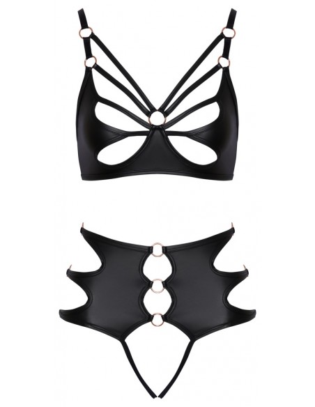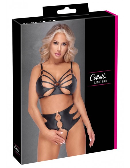 Un reggiseno e mutandine senza cavallo in un set di Cottelli LINGERIE realizzato in morbido materiale elasticizzato nero. Uno stile audace con cinturini elastici e anelli color oro rosa. Reggiseno morbido con chiusura con gancio sul retro e spalline regolabili abbinate. Le mutandine dal taglio alto in vita seducono con 2 fasce elastiche attorno al cavallo completamente aperto.