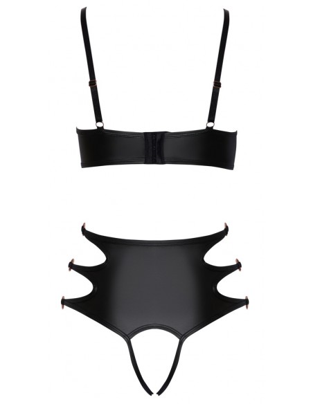 Un reggiseno e mutandine senza cavallo in un set di Cottelli LINGERIE realizzato in morbido materiale elasticizzato nero. Uno stile audace con cinturini elastici e anelli color oro rosa. Reggiseno morbido con chiusura con gancio sul retro e spalline regolabili abbinate. Le mutandine dal taglio alto in vita seducono con 2 fasce elastiche attorno al cavallo completamente aperto.