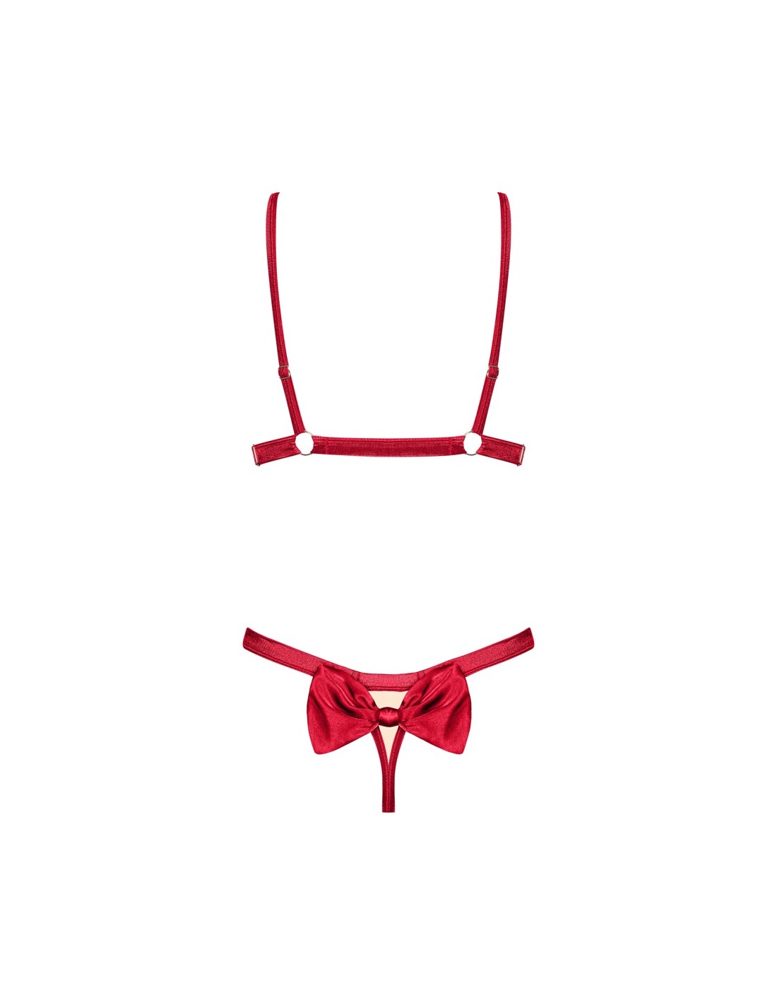Morbido set reggiseno e perizoma Rubinesa di Obsessive in raso rosso con riflessi dorati. Coppe del reggiseno aperte e fiocco decorativo in raso sul sedere. Reggiseno con chiusura anteriore e spalline regolabili. Perizoma color nudo in morbido materiale elasticizzato con contrasti rossi.