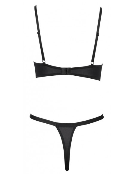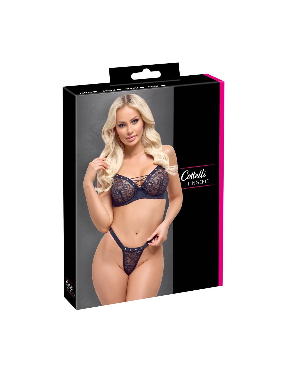 Reggiseno e perizoma con ferretto in un set nero di Cottelli LINGERIE. Coppe e stringhe anteriori in pizzo morbido ed elastico con occhielli decorativi color argento. Piccola allacciatura decorativa tra le coppe con ferretto. Chiusura con gancio regolabile sul retro. Anche le spalline sono regolabili per una perfetta vestibilità. Perizoma Rio con comoda fascia elastica in vita.