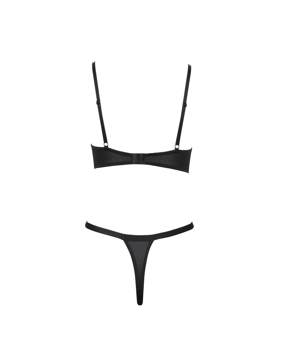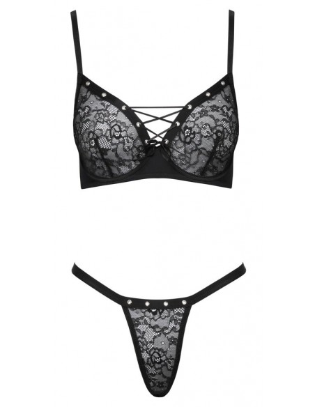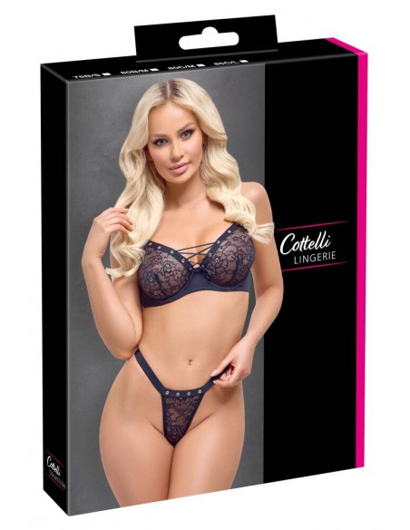 Reggiseno e perizoma con ferretto in un set nero di Cottelli LINGERIE. Coppe e stringhe anteriori in pizzo morbido ed elastico con occhielli decorativi color argento. Piccola allacciatura decorativa tra le coppe con ferretto. Chiusura con gancio regolabile sul retro. Anche le spalline sono regolabili per una perfetta vestibilità. Perizoma Rio con comoda fascia elastica in vita.