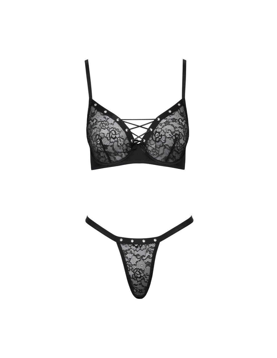 Reggiseno e perizoma con ferretto coppe e stringhe anteriori in pizzo morbido con occhielli decorativi color argento L