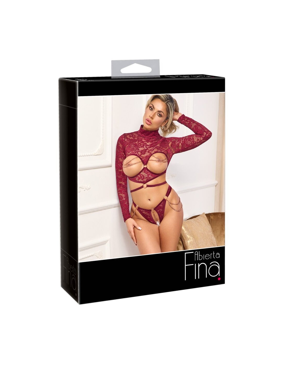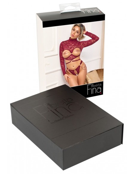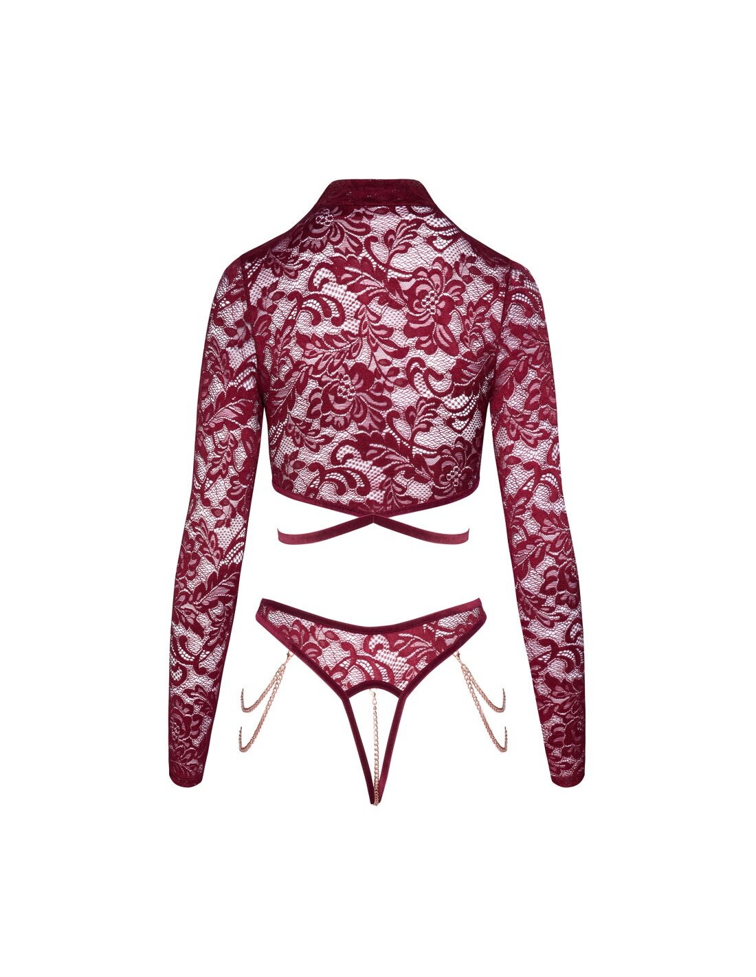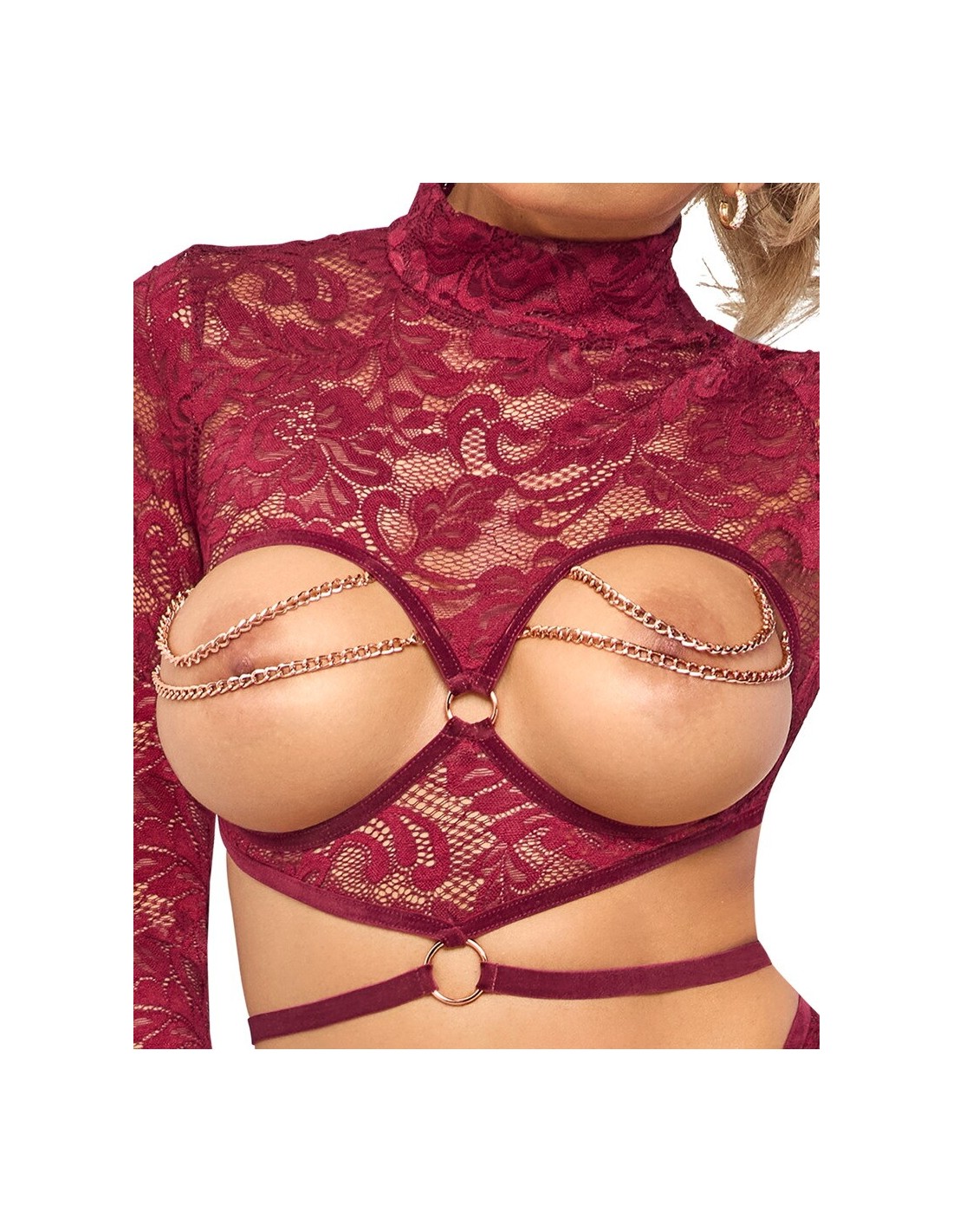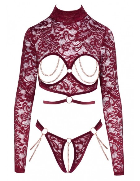 Eccitante set di Abierta Fina con top a maniche lunghe senza busto e perizoma inguinale. Fine pizzo rosso scuro seducente con nastri di velluto e catene e anelli color oro rosa. Morbido ed elastico su tutto il corpo per un elevato livello di comfort. Top morbido con piccolo collo alto e cintura in velluto. Le catene gioiello sul busto esposto possono essere completamente rimosse. Così come le catene doppie sulle cosce e la catena stimolante nel cavallo aperto.